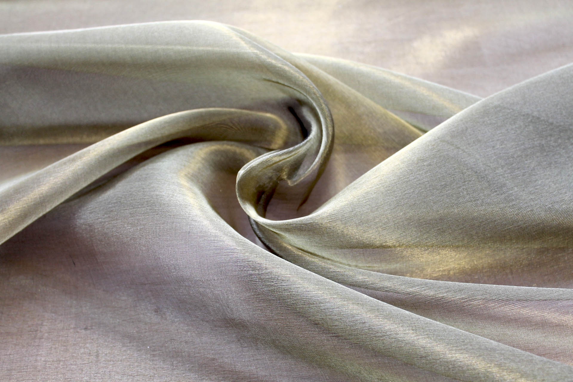 A sheer, structured organza in black shot pale gold. This is a 'shot' (two tone) organza made from black silk yarns and paler gold metal yarns. 52% silk, 48% metal.