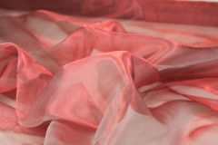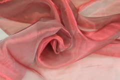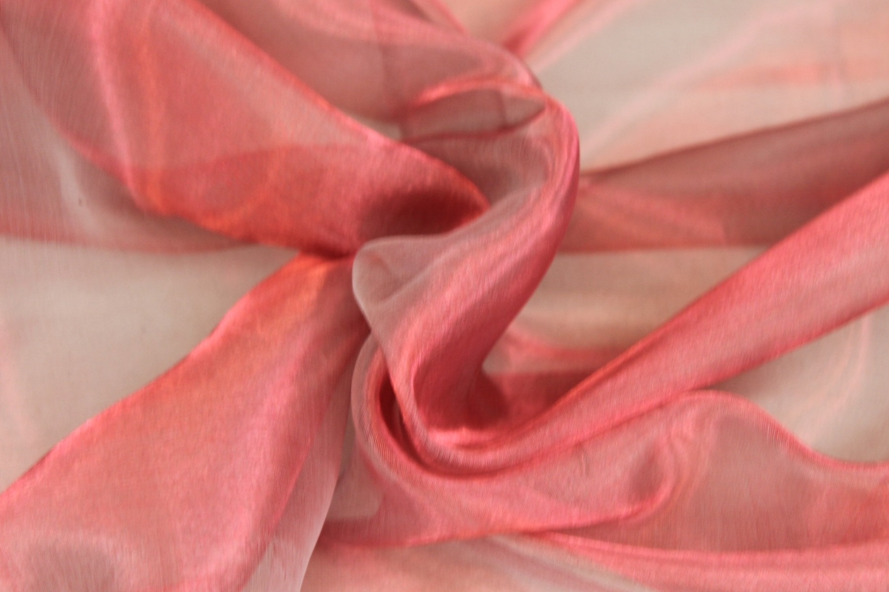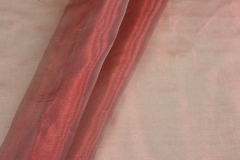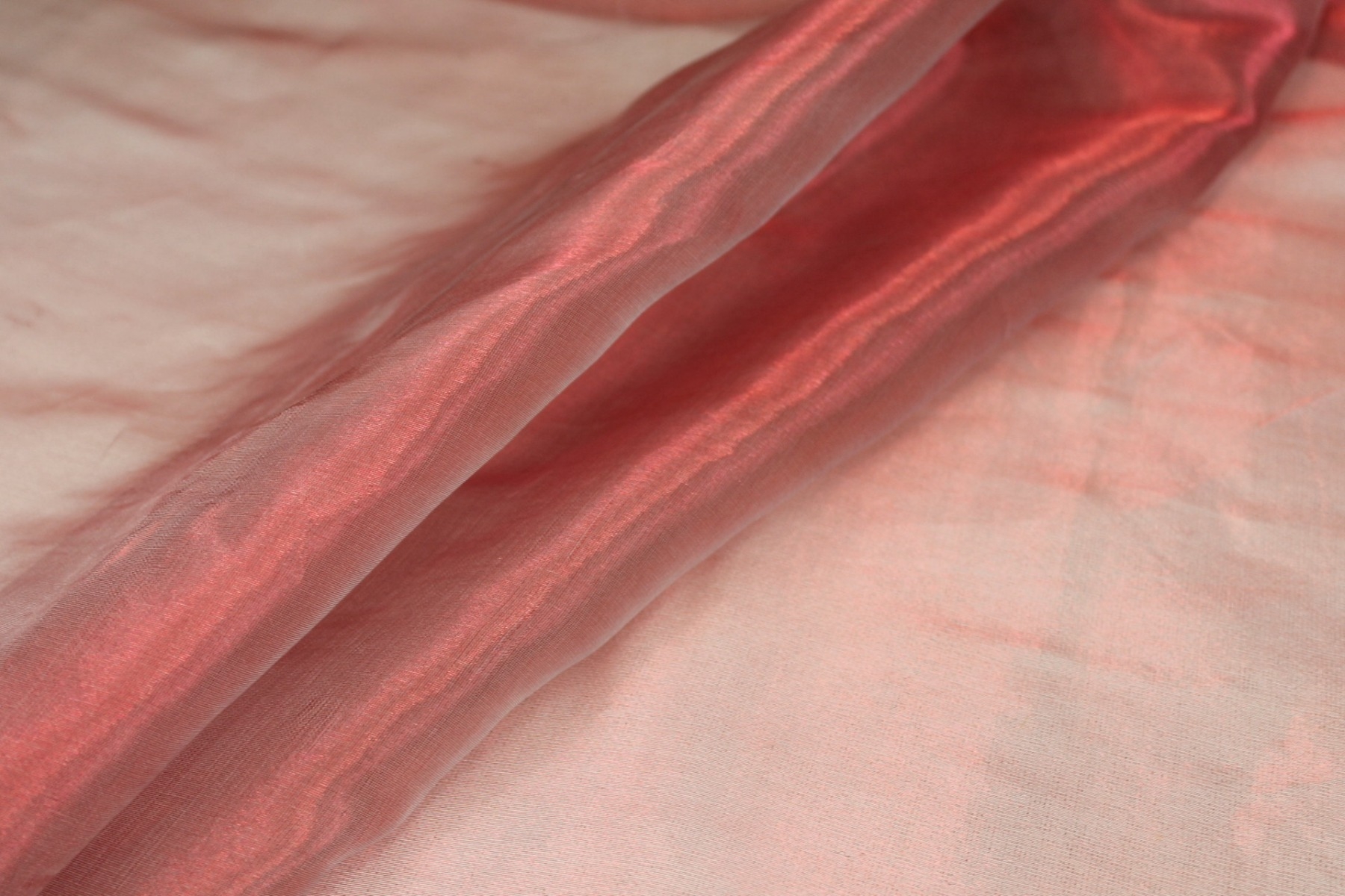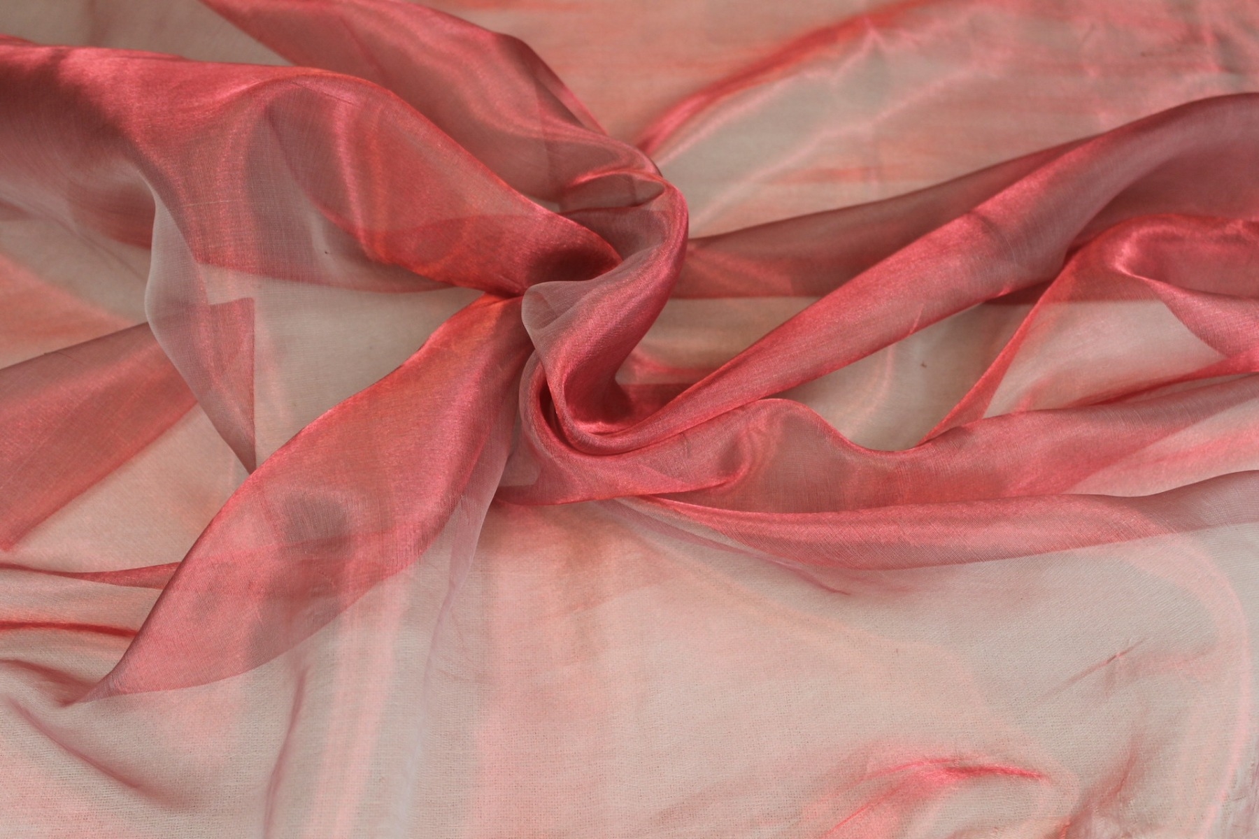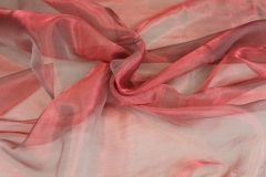 A sheer, structured organza in a shot colour way, woven with metallic red yarns and pale grey silk yarns to give an iridescent look. 52% silk, 48% metal.