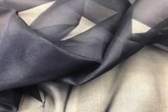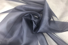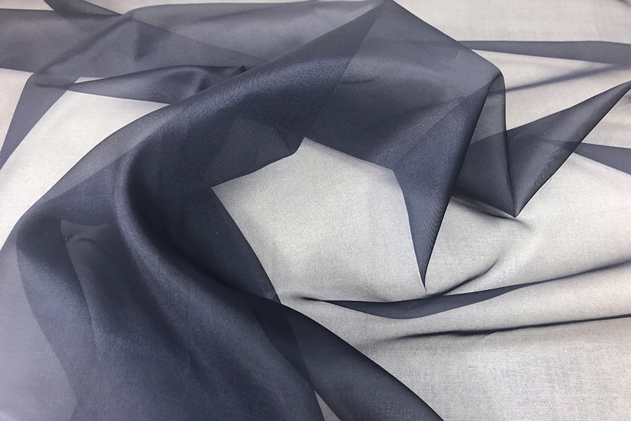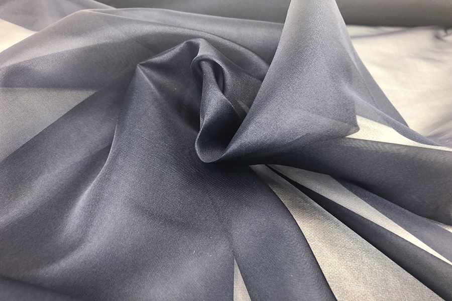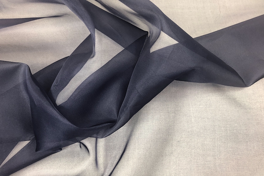 A sheer, structured organza in navy. This is a flat shade organza with matching weft and warp yarns. 100% silk.