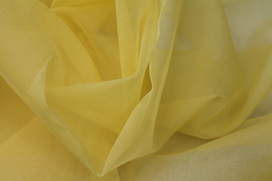 A sheer, structured organza in a soft primrose yellow colour. This is a flat shade organza with matching weft and warp yarns. 100% silk and wide width at 140cm.