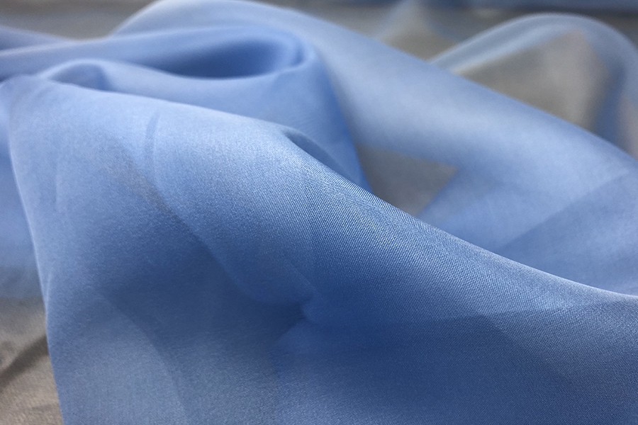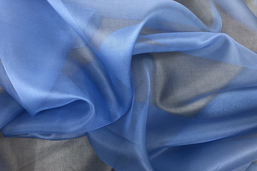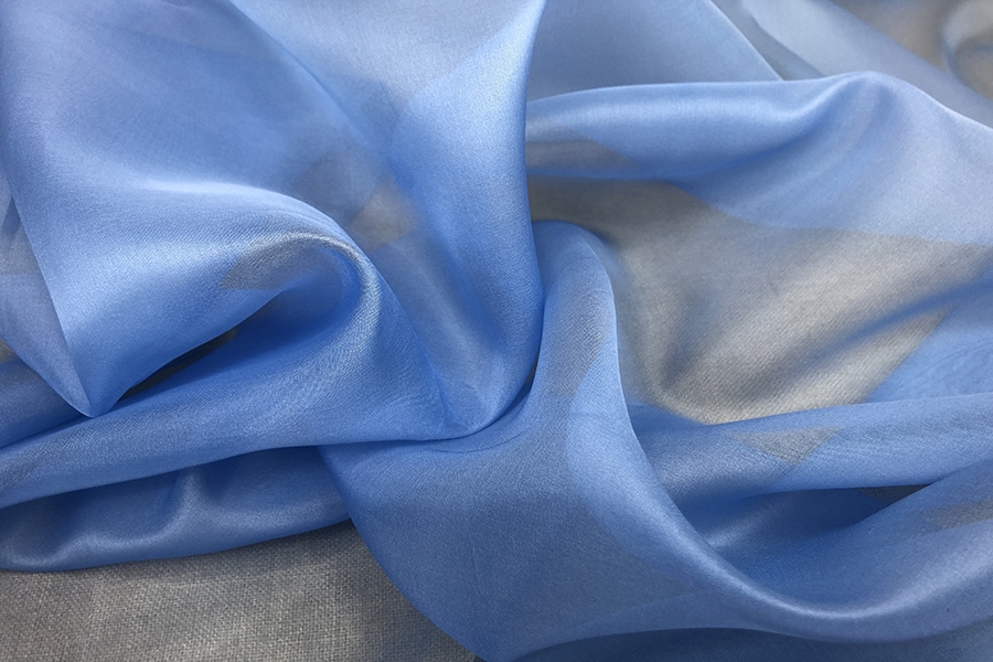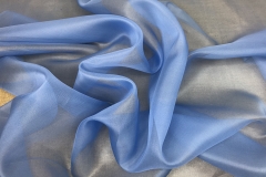 A sheer, floaty organza in sky blue. This is a flat sheer organza made from sky blue yarns warp and weft, non metallic. 110cm wide, 100% silk.
