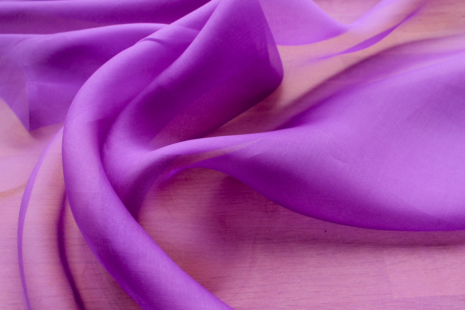 A sheer, structured organza in bright violet. This is a plain colour organza made from the same violet yarns warp and weft. 100% silk.