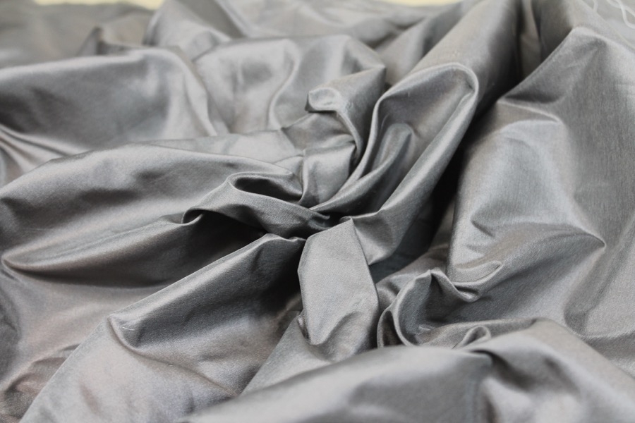 This is a lighter weight 100% silk taffeta with a softer structure, woven tightly to give the classic smooth taffeta finish, in a dark mushroom grey.
