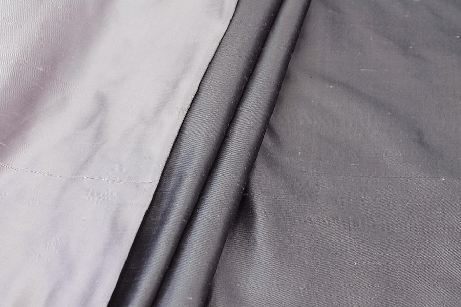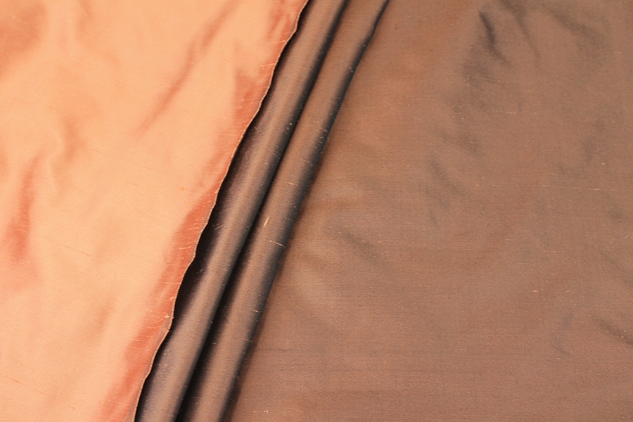 This is a beautifully structured pure silk dupion, woven in a two-tone of tan with black, with a twill weave using the black thread on one side and a traditional slub dupion finish to the other side. This is two different toned matching fabrics in one. 100% silk, 135 cm wide.