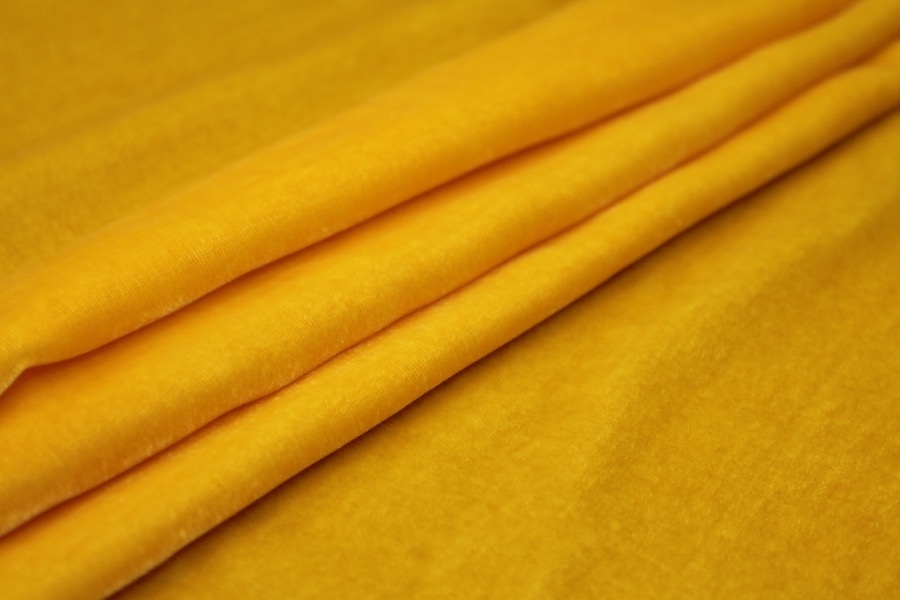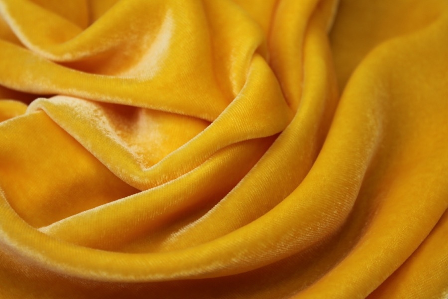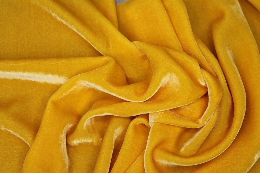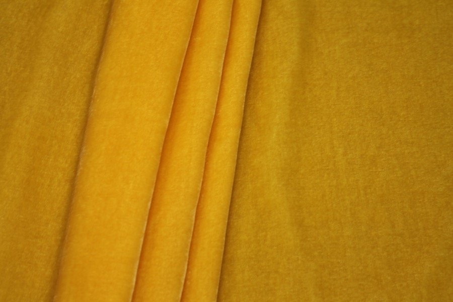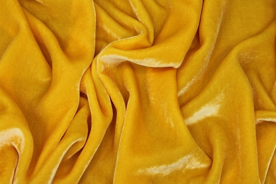 A luxurious, soft, drapey silk velvet composed of a bright yellow silk chiffon base and a matching viscose pile. It is 140cm wide. This velvet can also be used for devoré. 82% viscose 18% silk, approx 180g per linear metre.