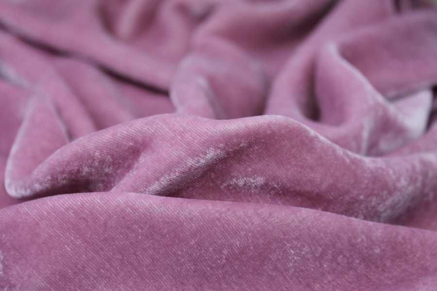 A luxurious, soft, drapey silk velvet composed of a light blush pink chiffon base and a wisteria pink viscose pile, giving a pretty dusty pink colour. This velvet can also be used for devoré and is dyeable. 82% viscose 18% silk, approx 180g per linear metre.