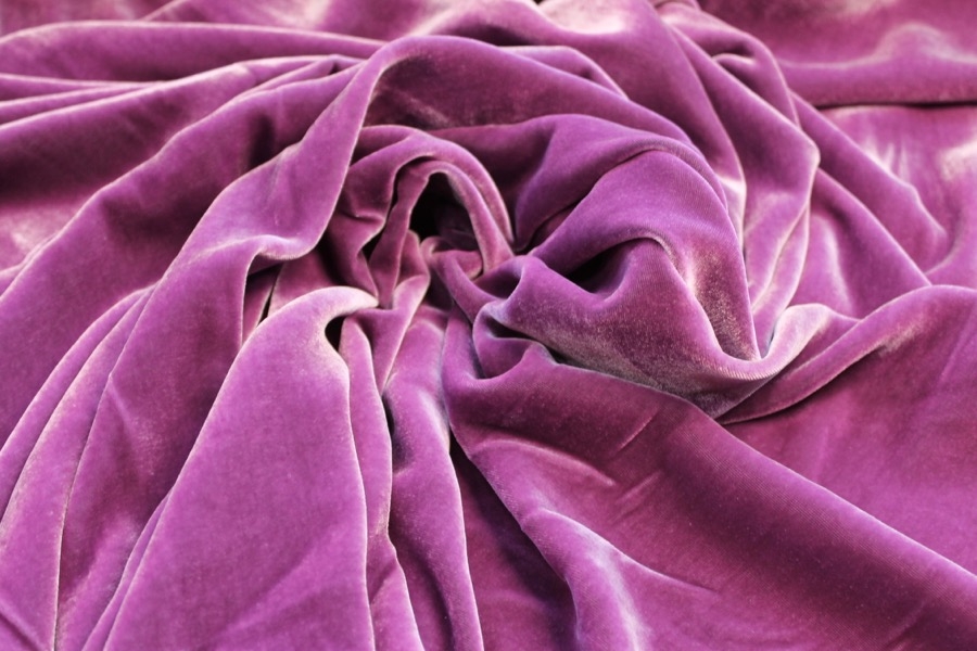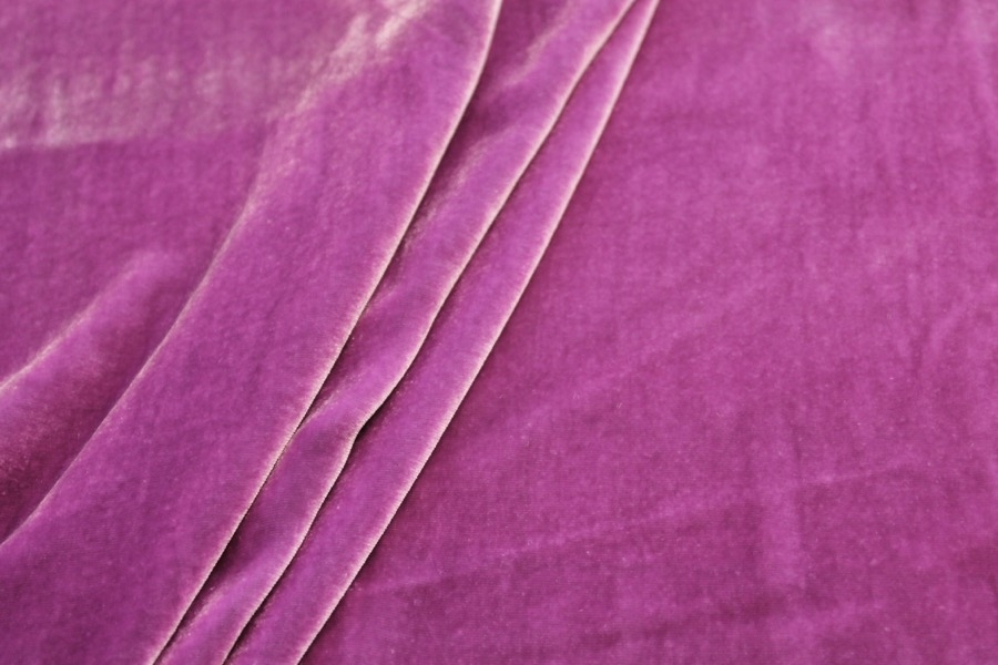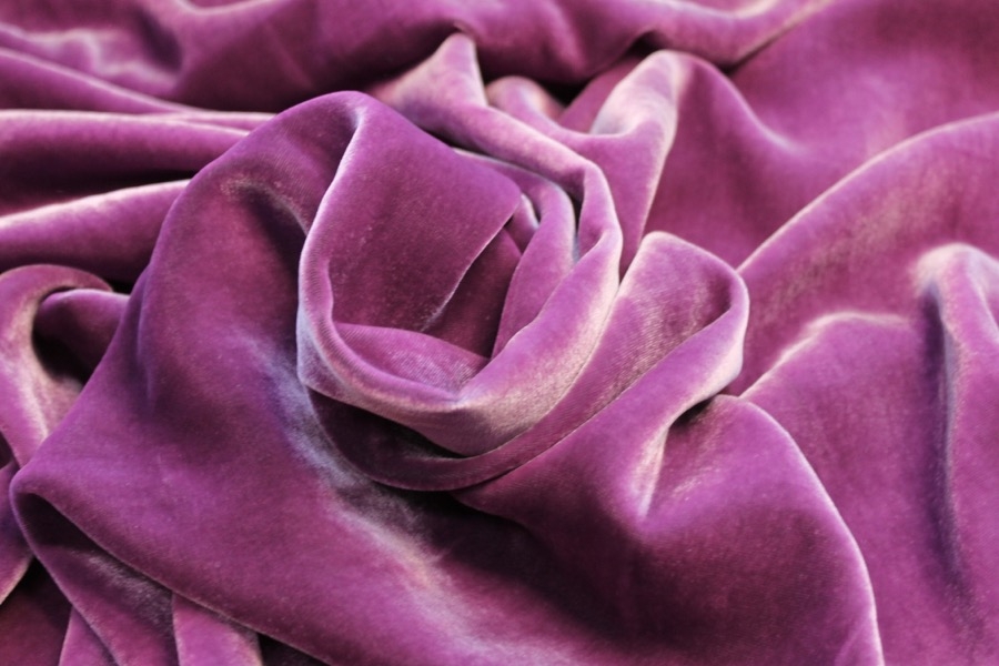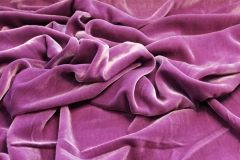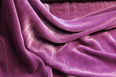 A luxurious, soft, drapey silk velvet composed of a silk chiffon base and a plush viscose pile, giving a pretty purple-ish colour we have named Orchid. This velvet can also be used for devoré and is dyeable. 82% viscose 18% silk, approx 180g per linear metre.