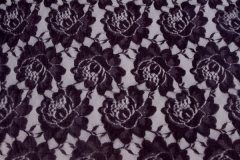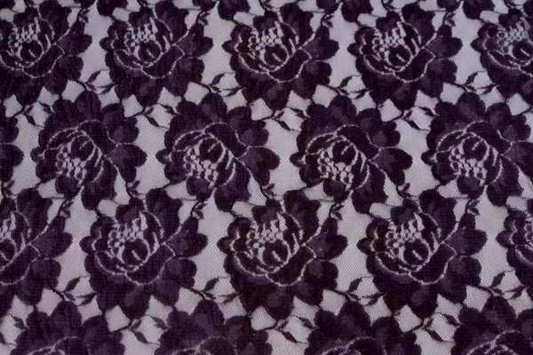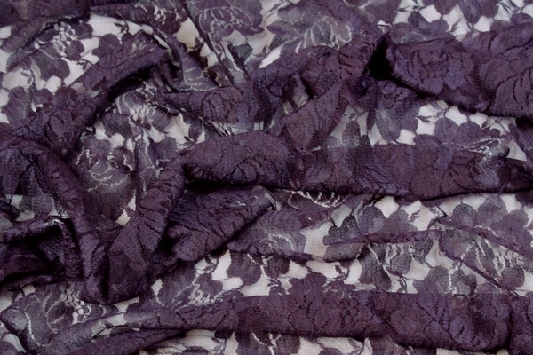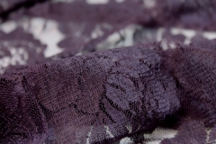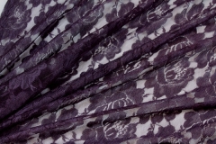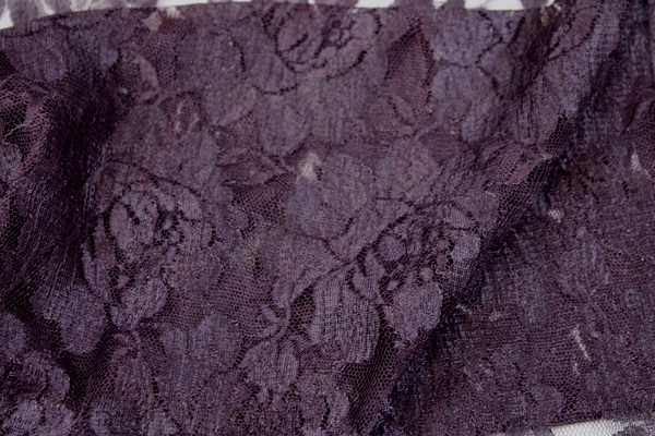 A simple but pretty lace in aubergine, an inexpensive alternative for fashion choices. This lace is only 90cm wide and has no scalloped edges. Great for beading work. 100% nylon.