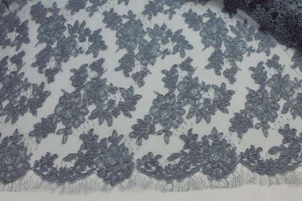 A high quality French corded lace in slate grey. Extra wide, 140cm. Double scallop.