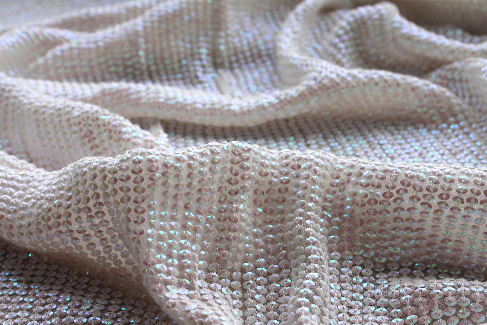 PLEASE NOTE: This new batch uses a different shade of sequins to the previous batch, slightly paler/whiter. If you have used this sequin fabric in the past, we recommend ordering a new swatch using the Swatch button to compare it.