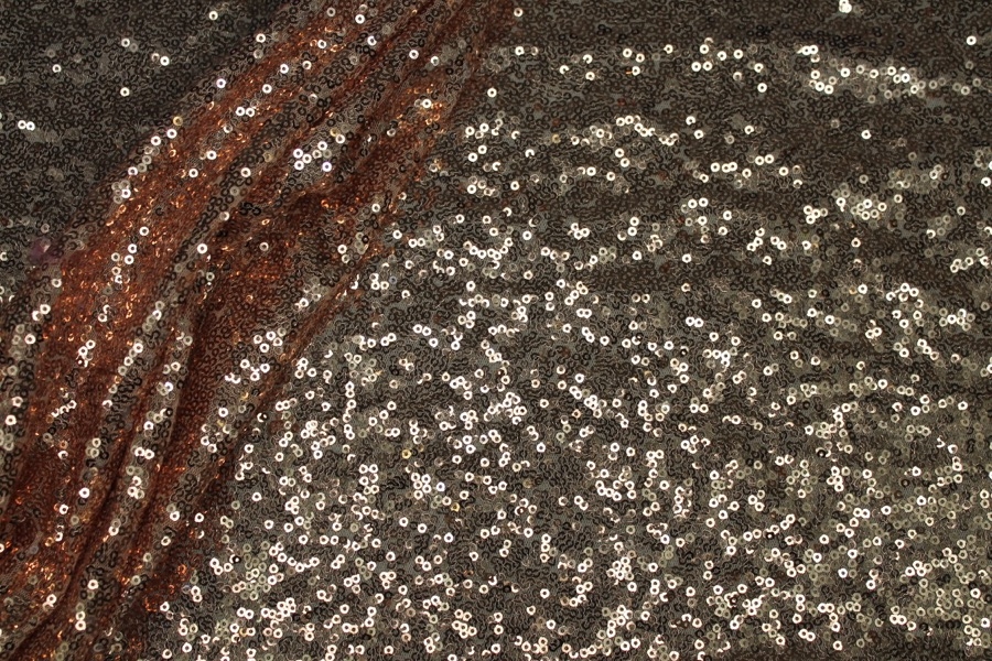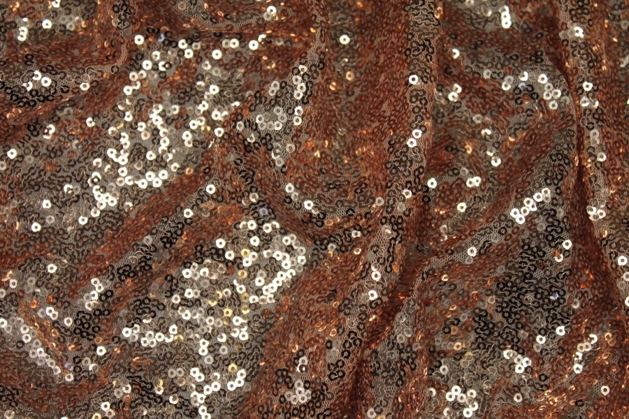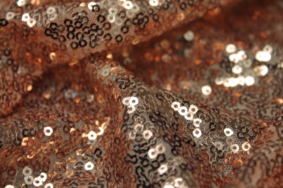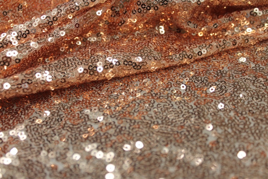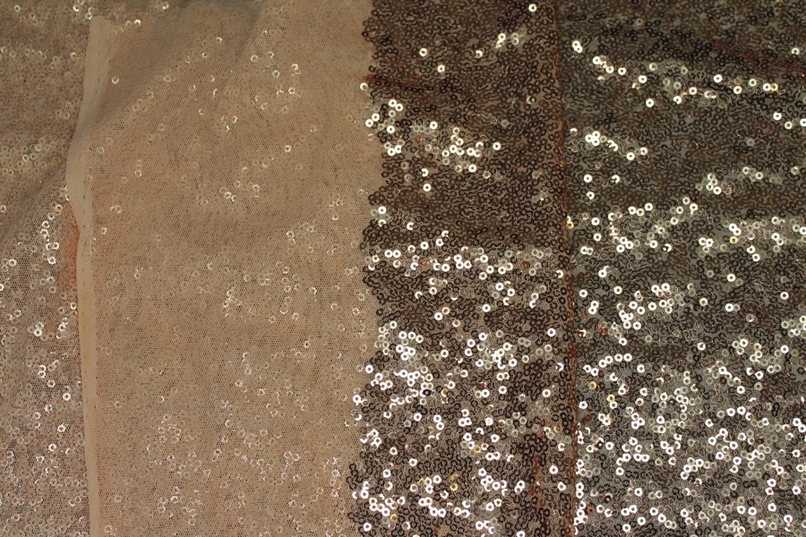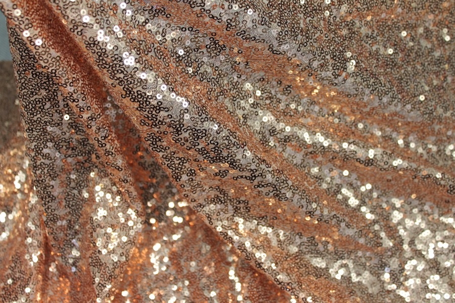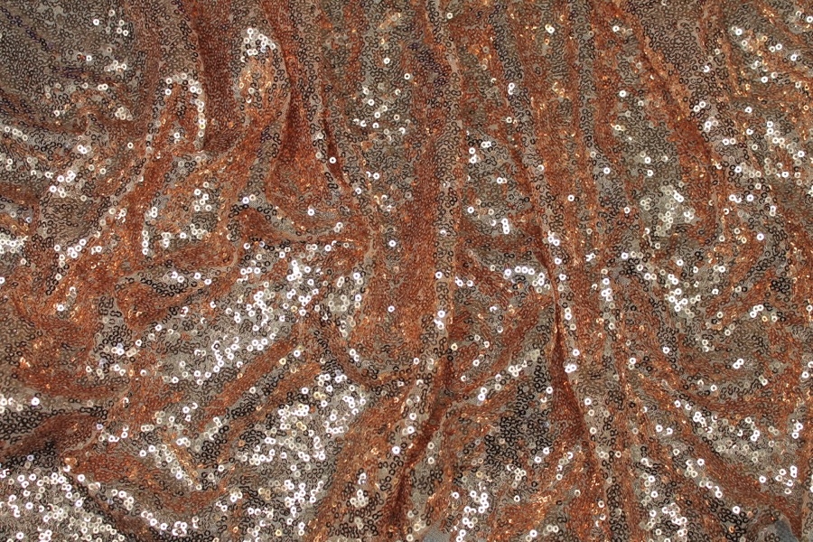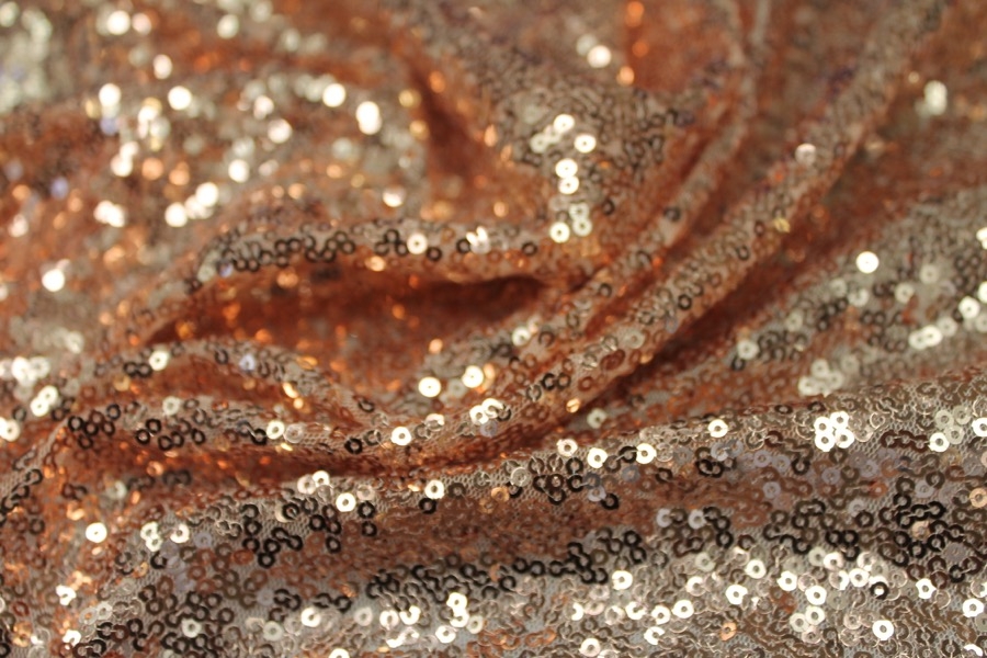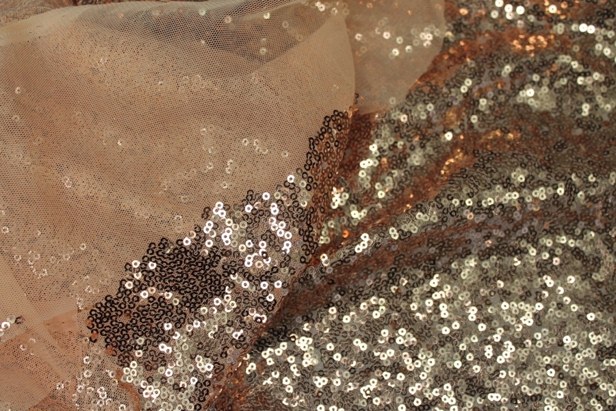 This is a tulle base fabric with a small amount of one-way stretch (selvedge to selvedge) embellished with tiny rose gold sequins in a squiggly pattern, the sequins measure approximately 3-4 mm across. It has great drape.