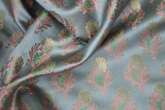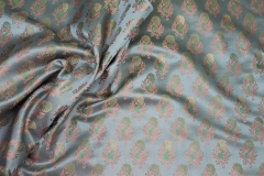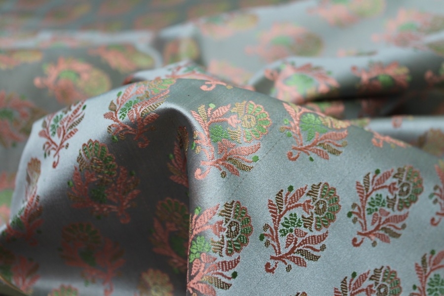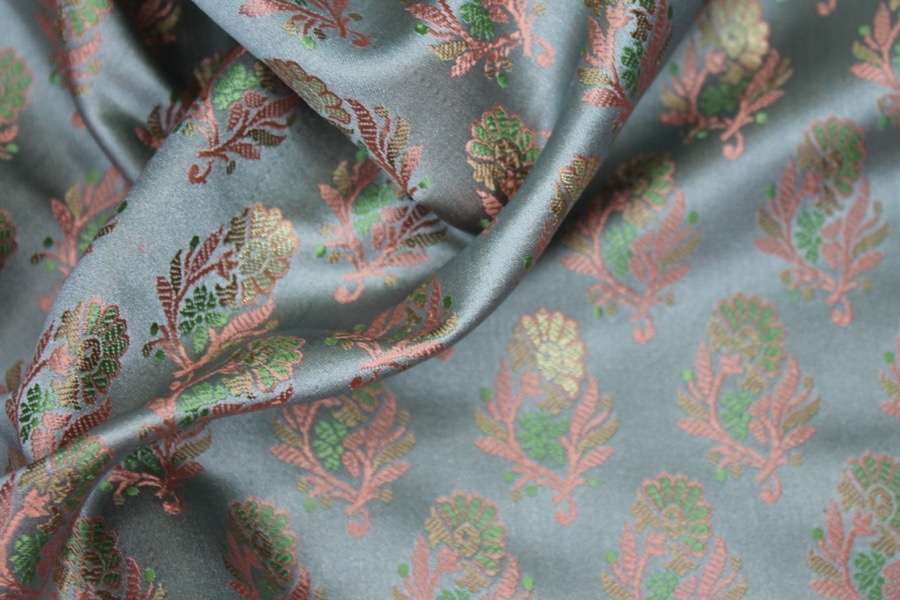 Soft brocade, from the Banaras region of India. Features pretty flowers in green and pink on pale blue, with gold metallic thread. 20% polyester (warp) 80% viscose (weft).