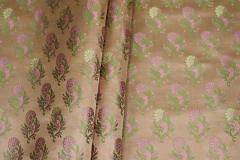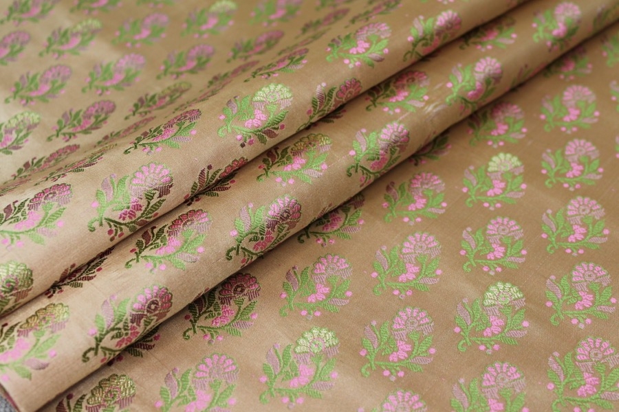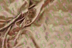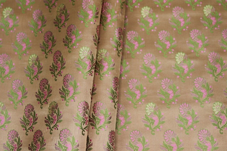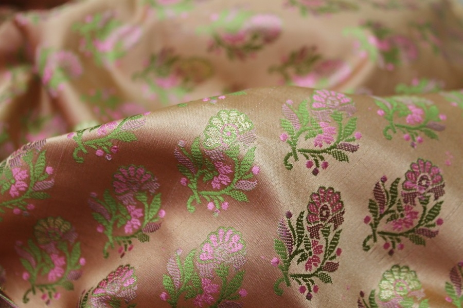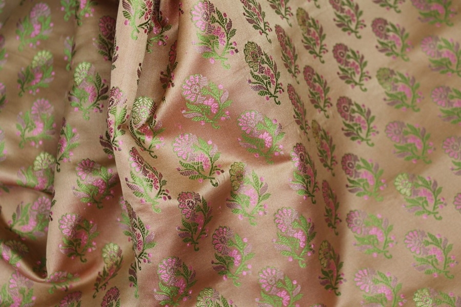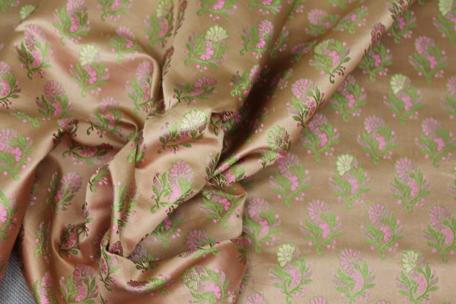 100% soft polyester brocade, from the Banaras region of India. Features pretty flowers in green and pink on peach, with gold metallic thread.