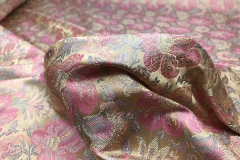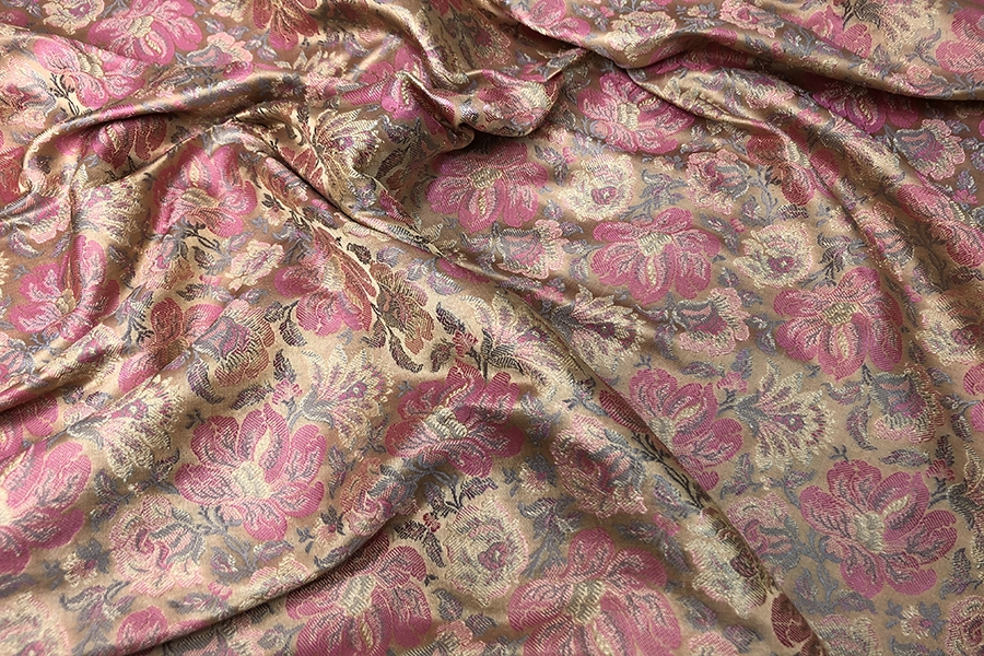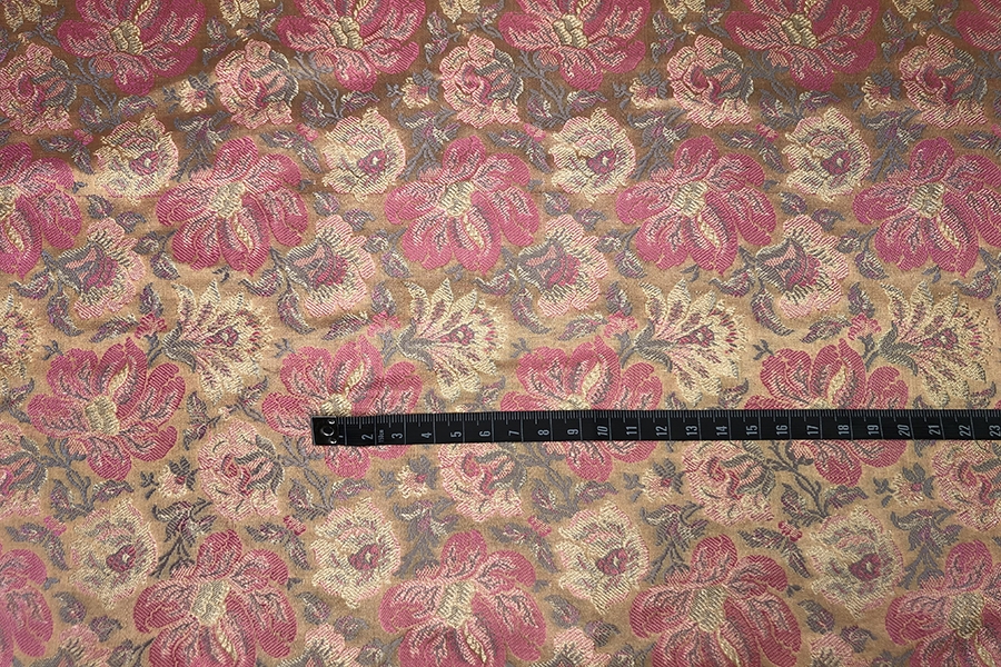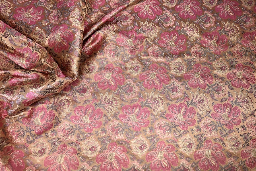 Mixed fibre brocade, from the Banaras region of India. Features a floral design in pinks, pale gold and a sandy khaki tone on a peach base, no metallic thread. Silk and viscose.