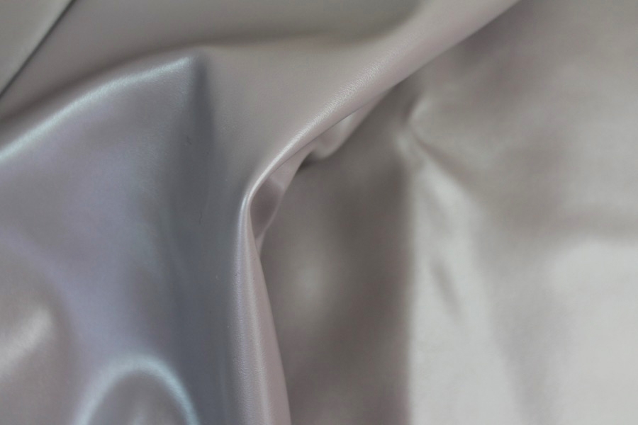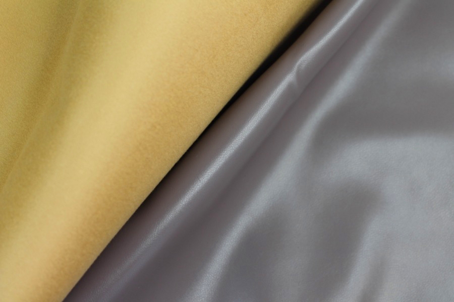 A European made leatherette in dusty lilac, with a small amount of stretch. A very soft and relatively thin quality with a tan fabric backing.