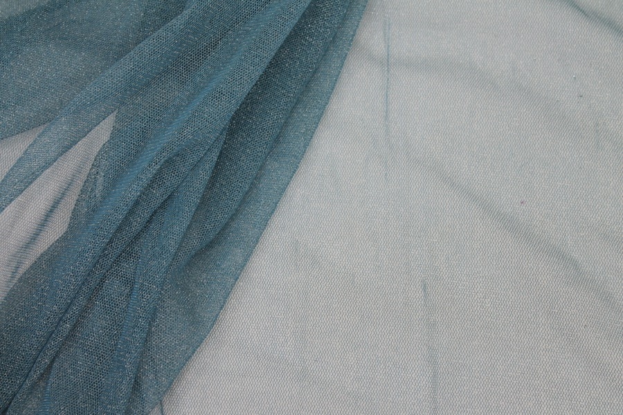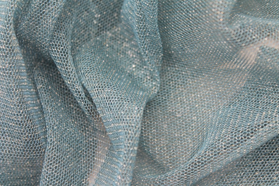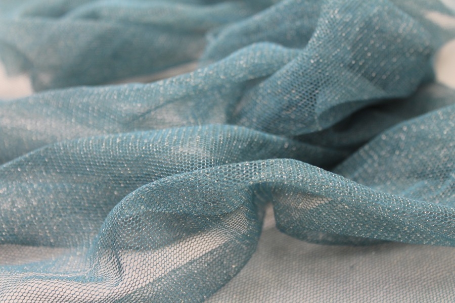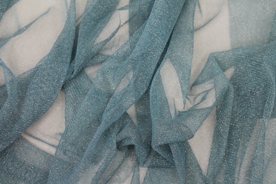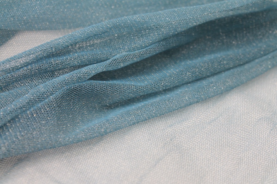 This is a soft tulle in dusty blue with a silver thread, making it appear sparkly but without the shedding of glitter. Also available in other colours.