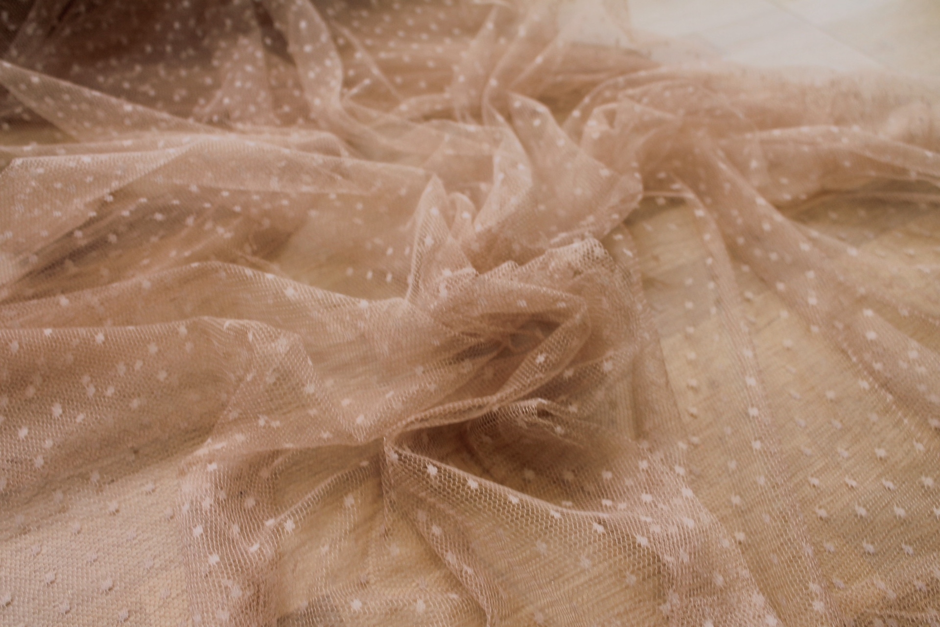 This viscose tulle has small woven in spots, great for overlaying in skirts, or for millinery. Nude or flesh in colour, also available in other colours.