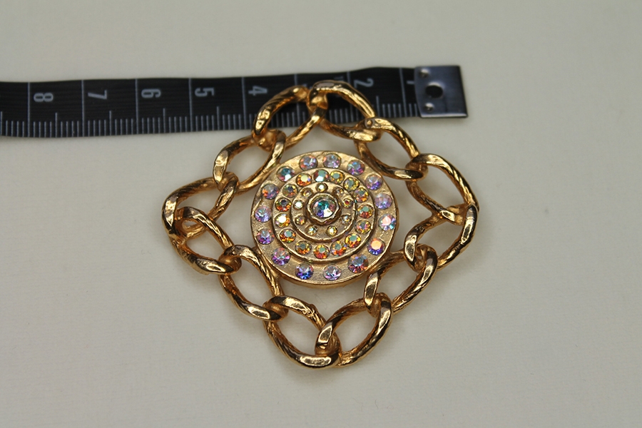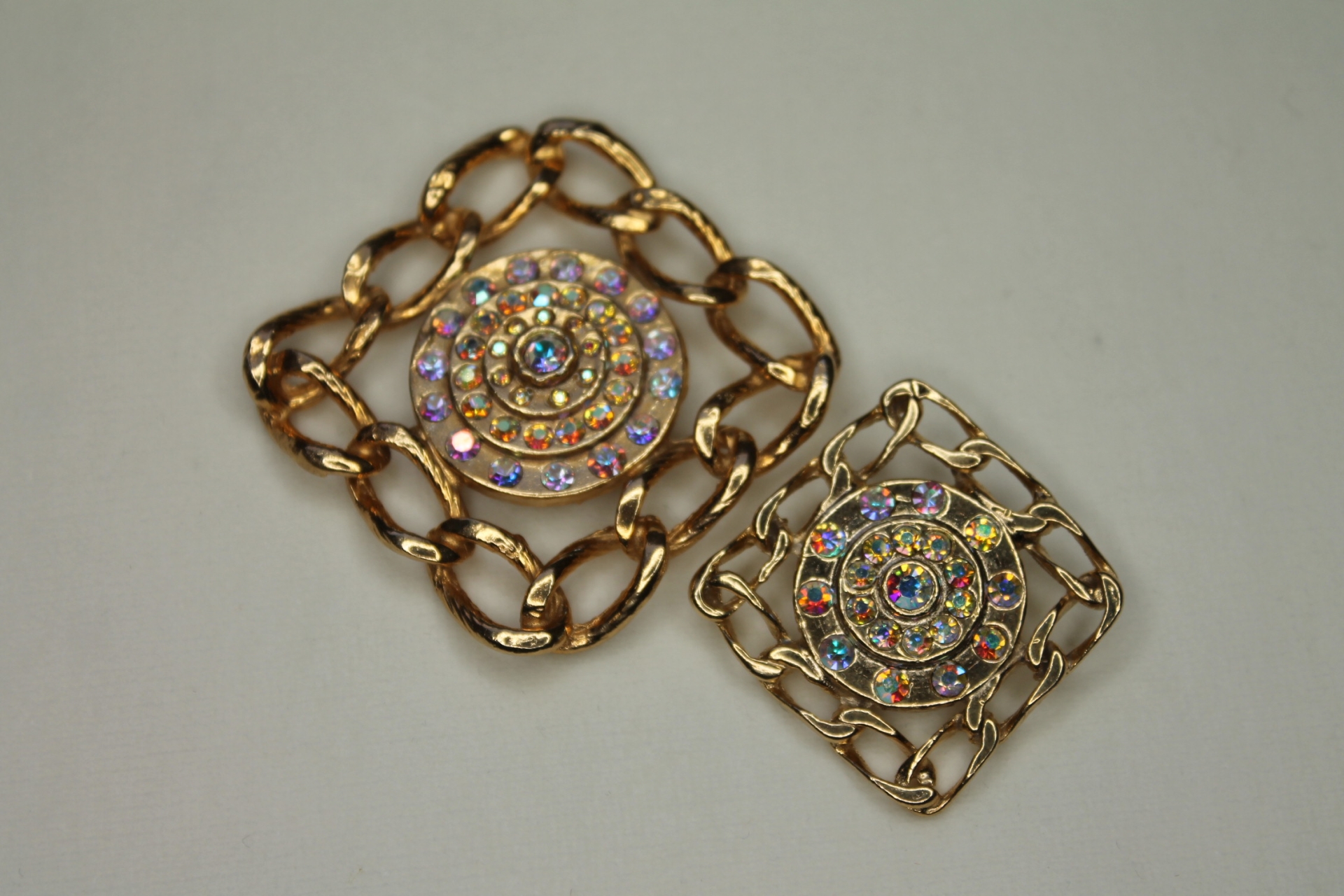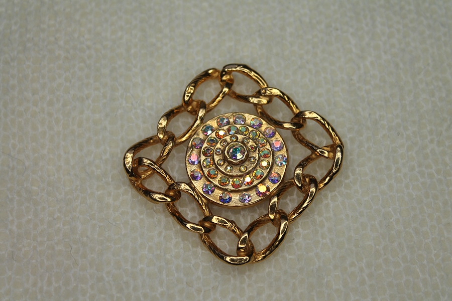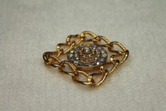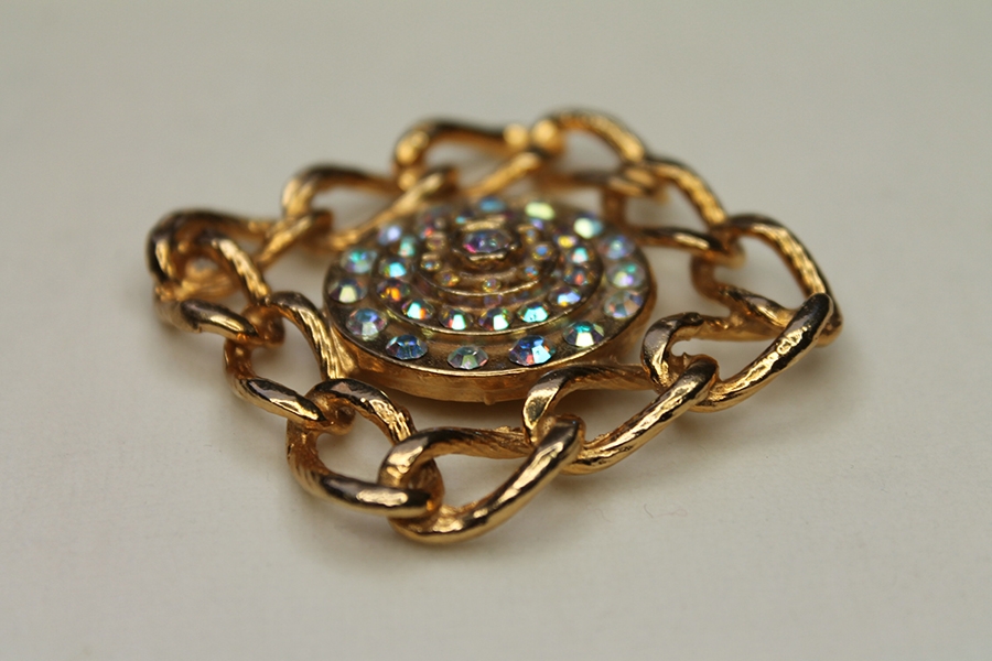 Vintage button made of gold coloured metal in a square chain design embelloshed with AB rhinestones. Measures 4.5cm across. LIMITED STOCK! Only 7 buttons available at time of listing.