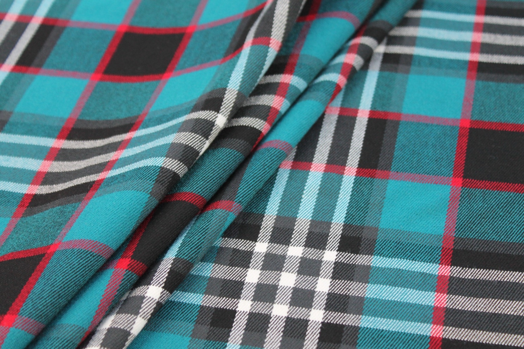 This is a woven tartan in a classic check combination of teal, red, black and white. 65% poly, 32% viscose and 3% elastane, feels like soft wool with a bit of stretch.