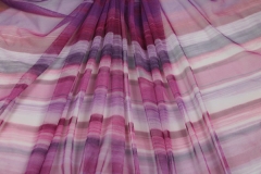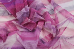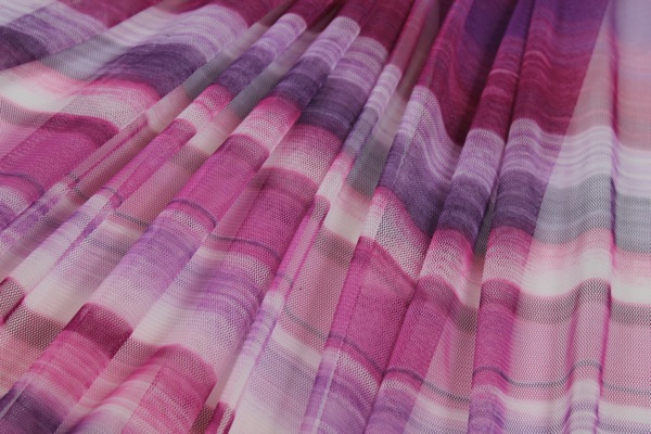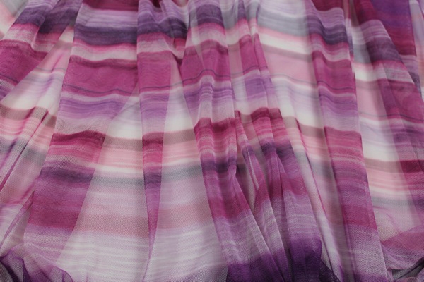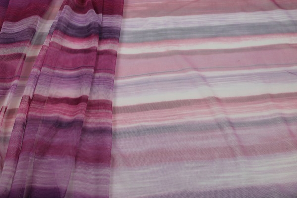 This is a stretch tulle, a sheer bodystocking mesh, great for dresses or costumes where transparency and give is needed. Sunset dyed in shades of purple and lilac and hot pink, also available in pink with orange.