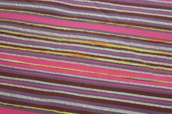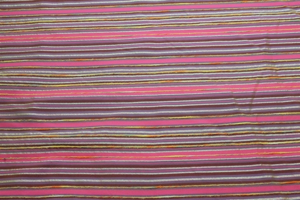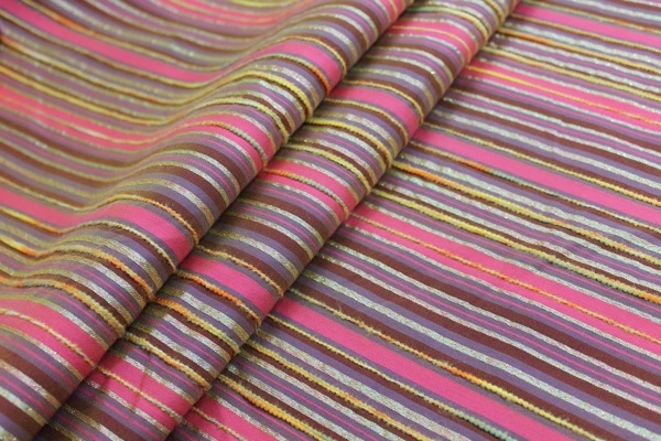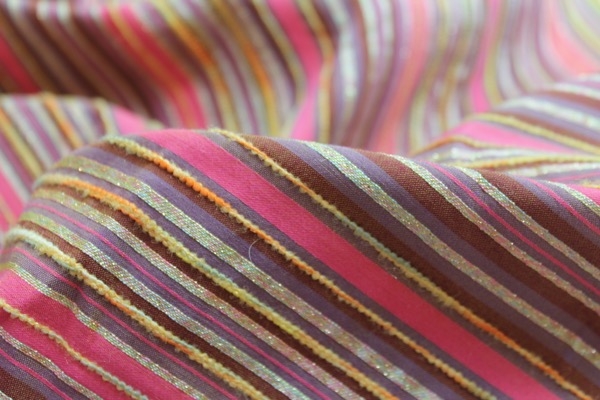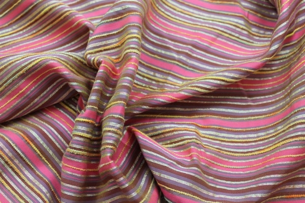 A pretty and colourful brocade in stripes in mauve, pink, maroon and orange, with a touch of lurex.