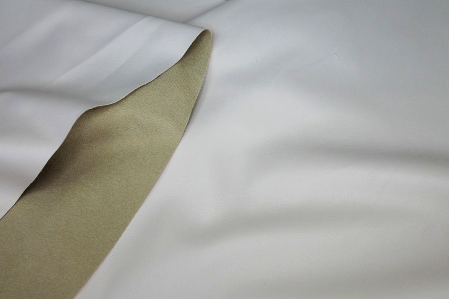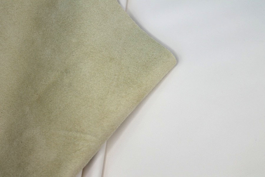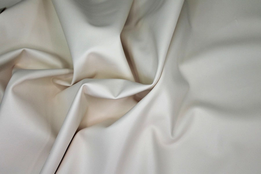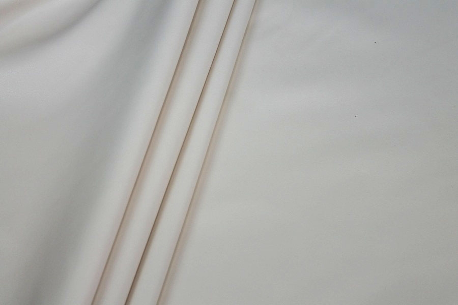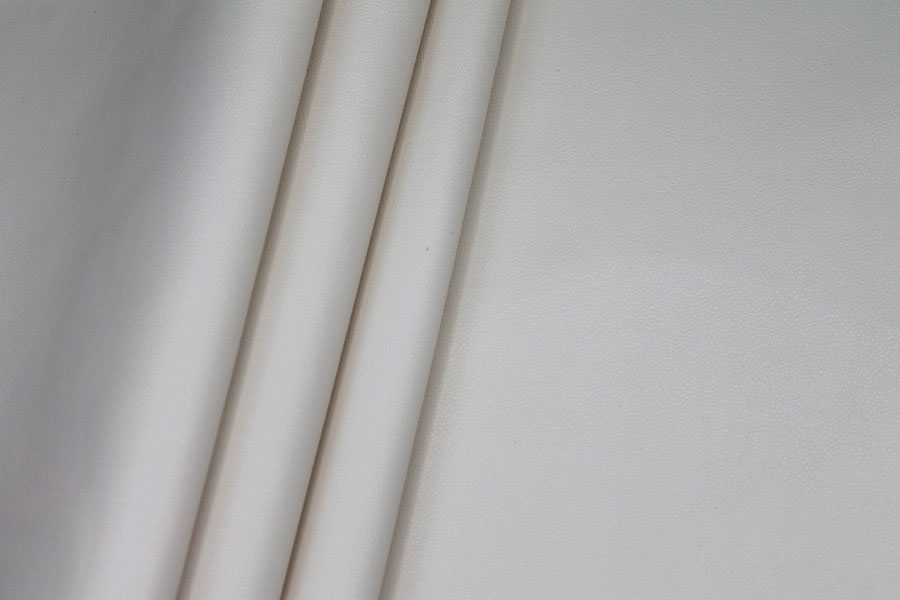 A European made leatherette in cream, with a small amount of stretch, the reverse has a soft suedette like texture. A very soft and relatively thin quality, like a glove leather.