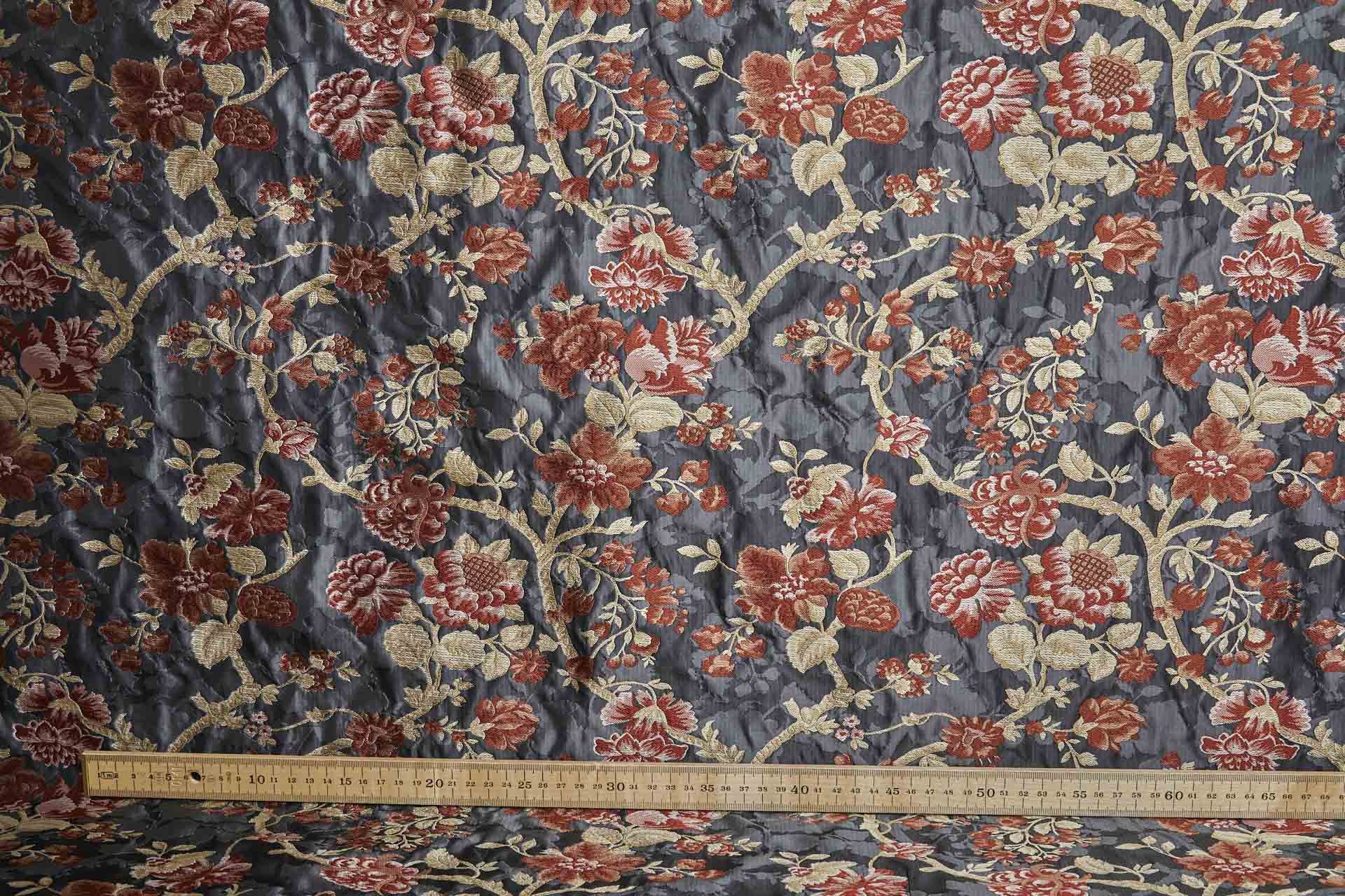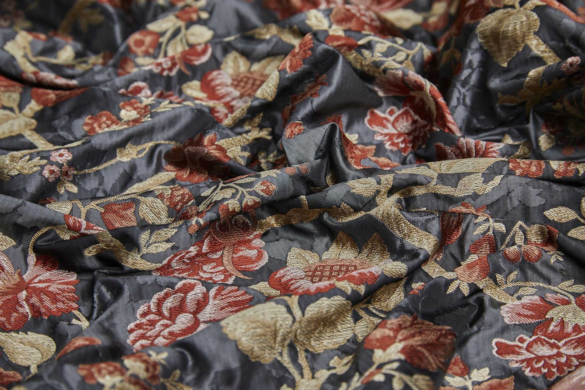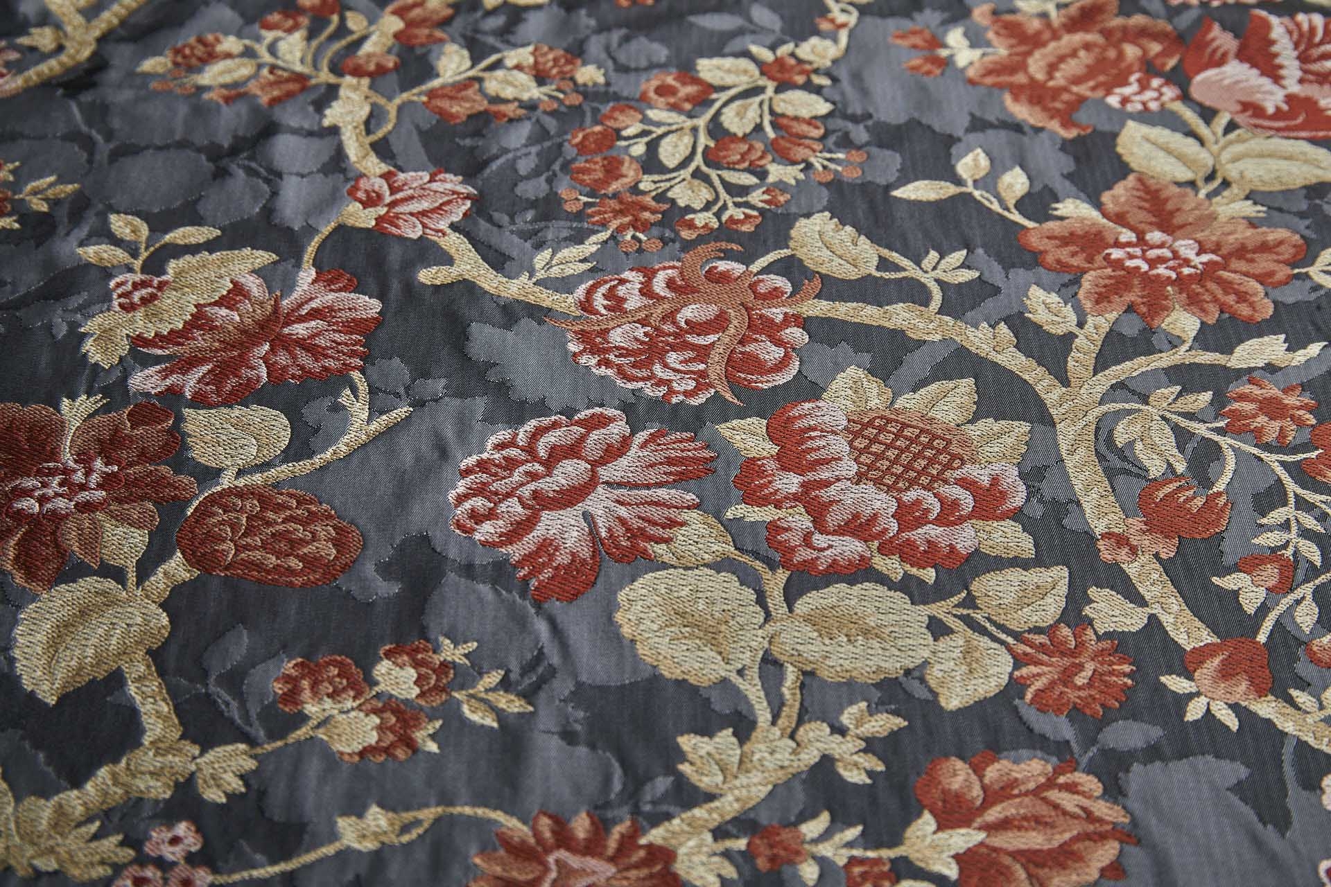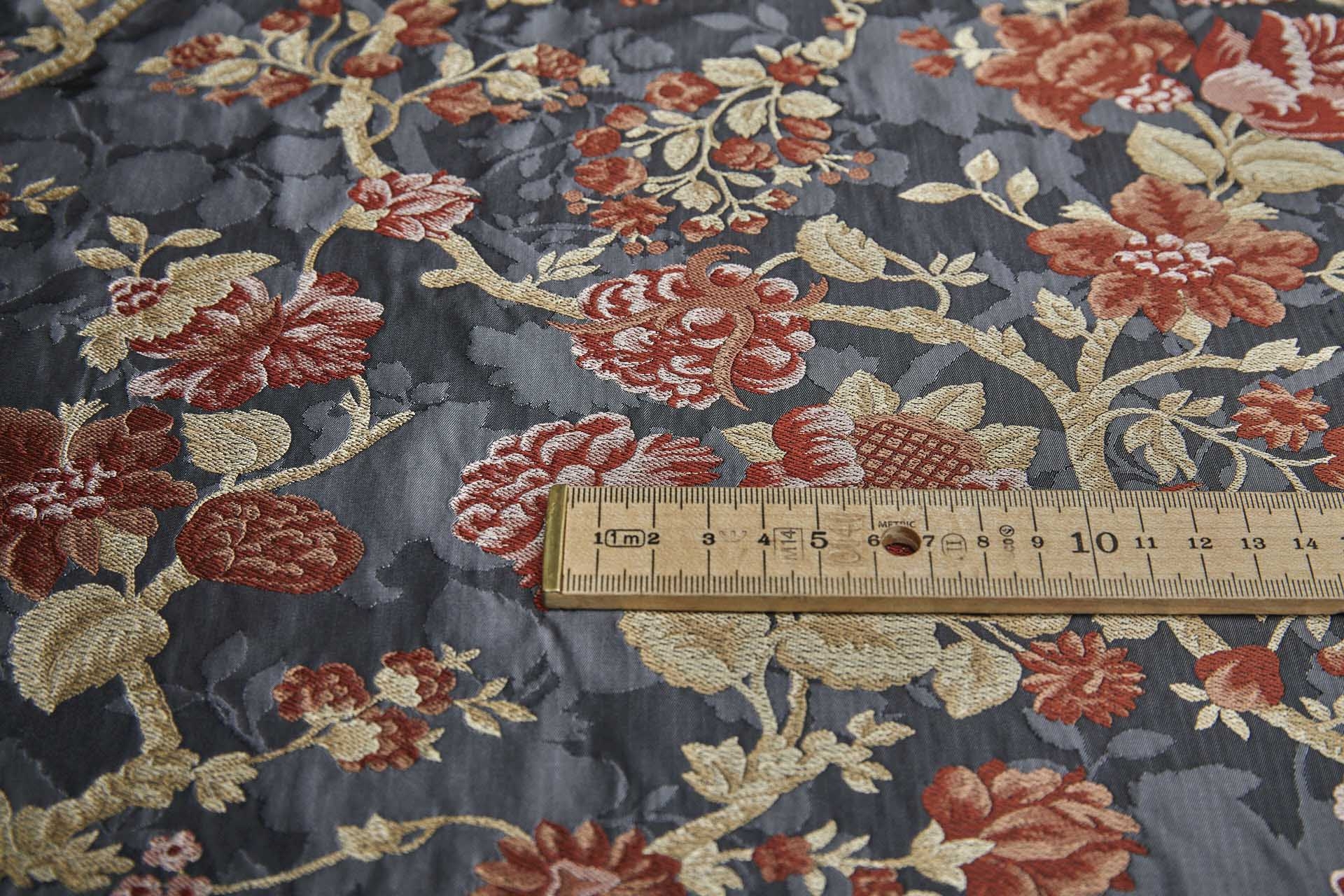 This European made tapestry style brocade features a large scale flower and branch pattern in red, pink and straw gold on charcoal grey. No metallic thread. 135cm wide.