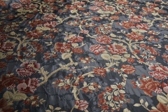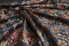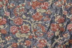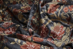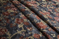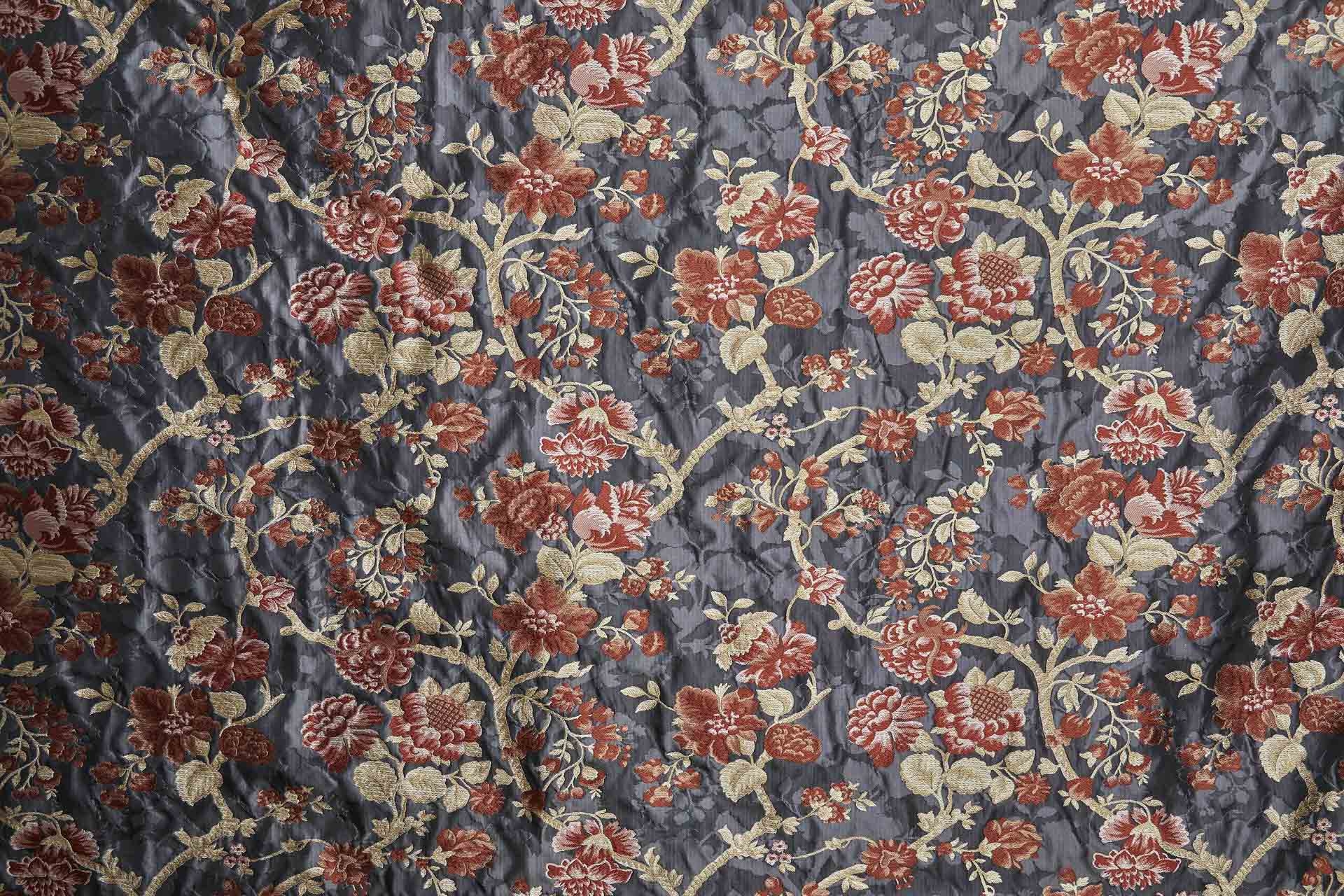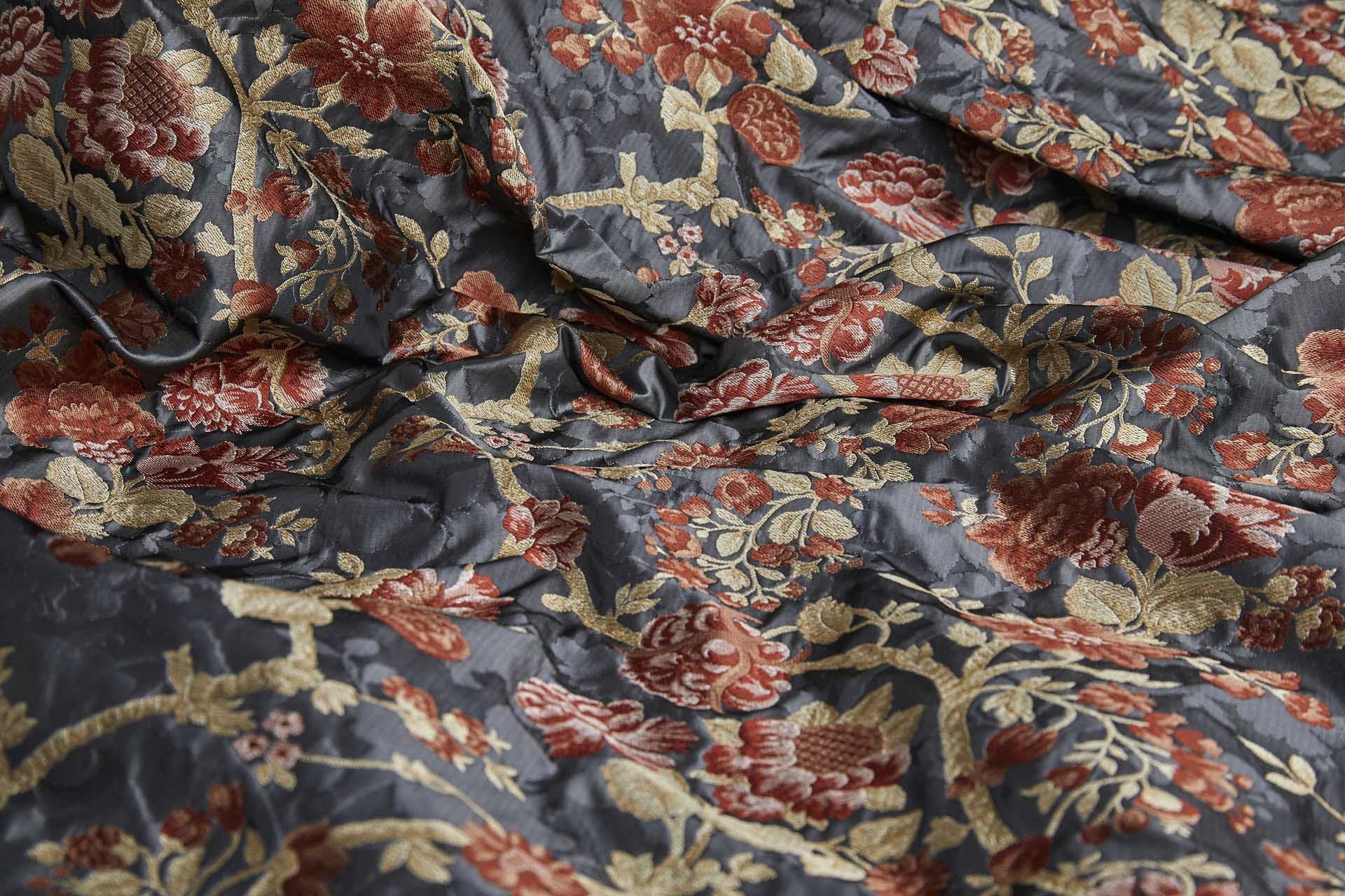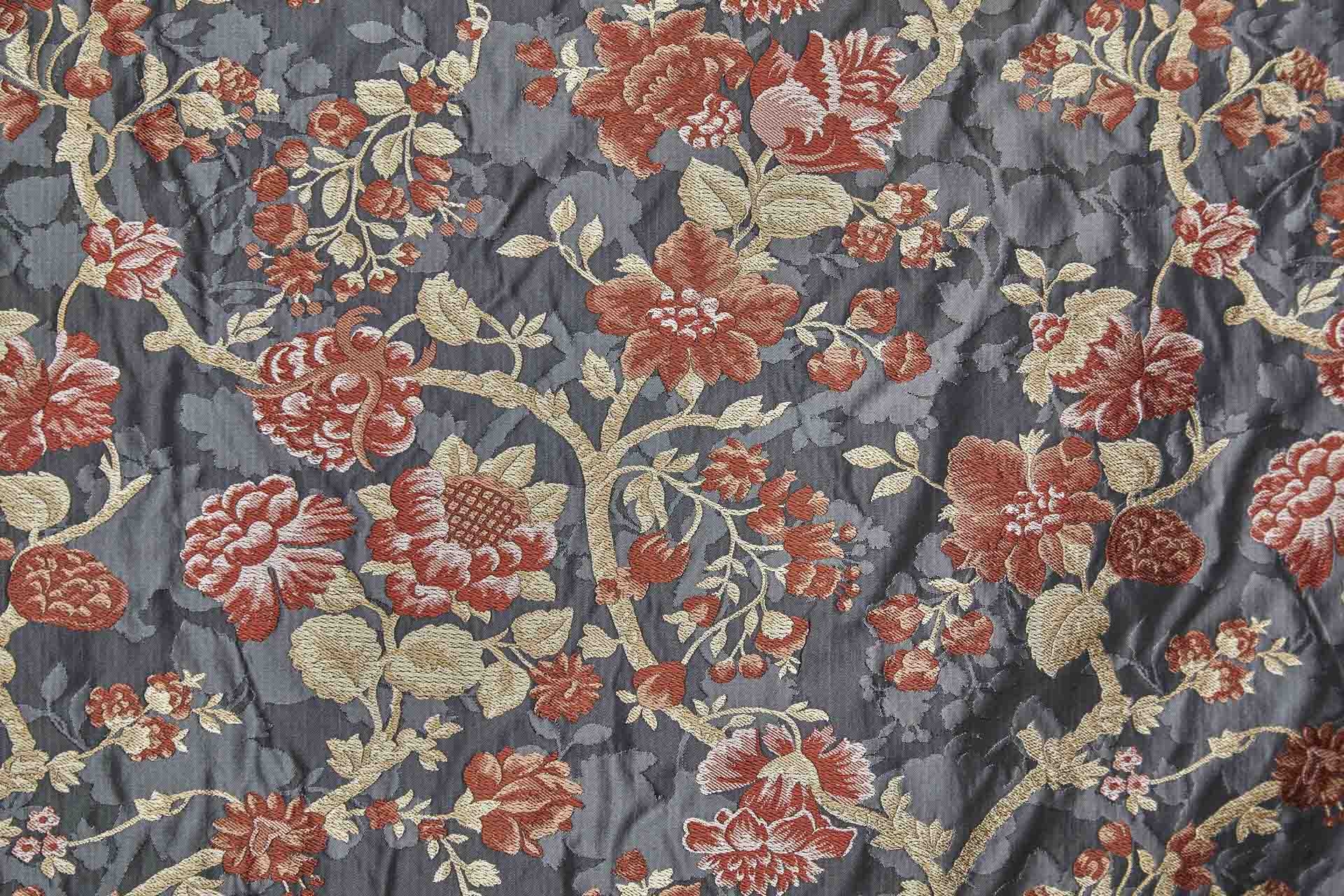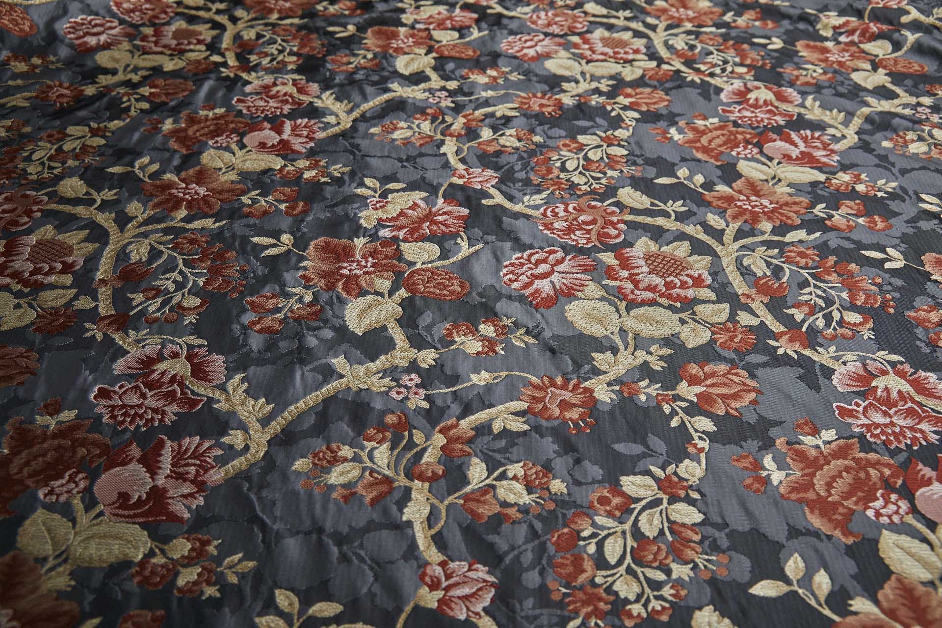 This European made tapestry style brocade features a large scale flower and branch pattern in red, pink and straw gold on charcoal grey. No metallic thread. 135cm wide.
