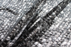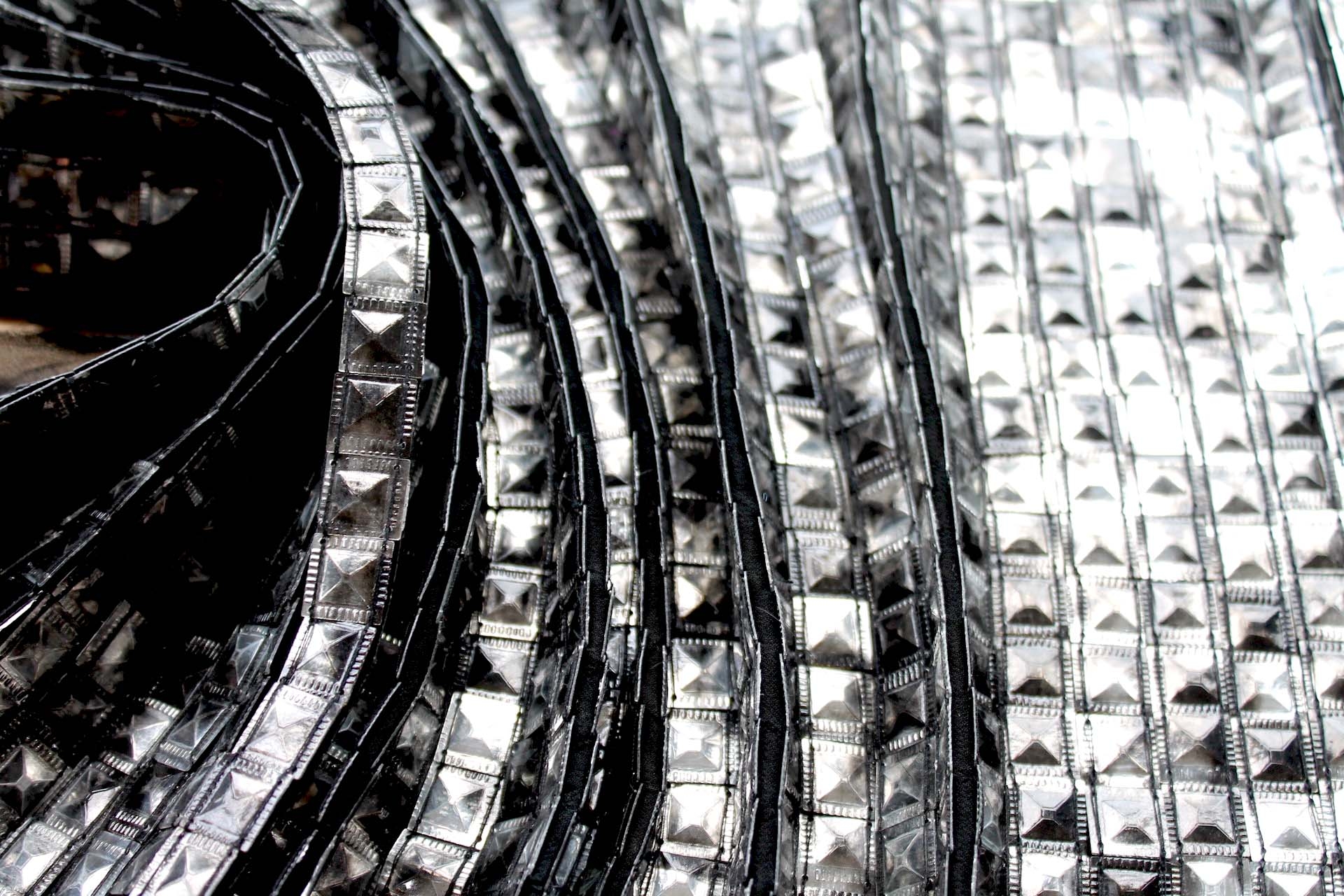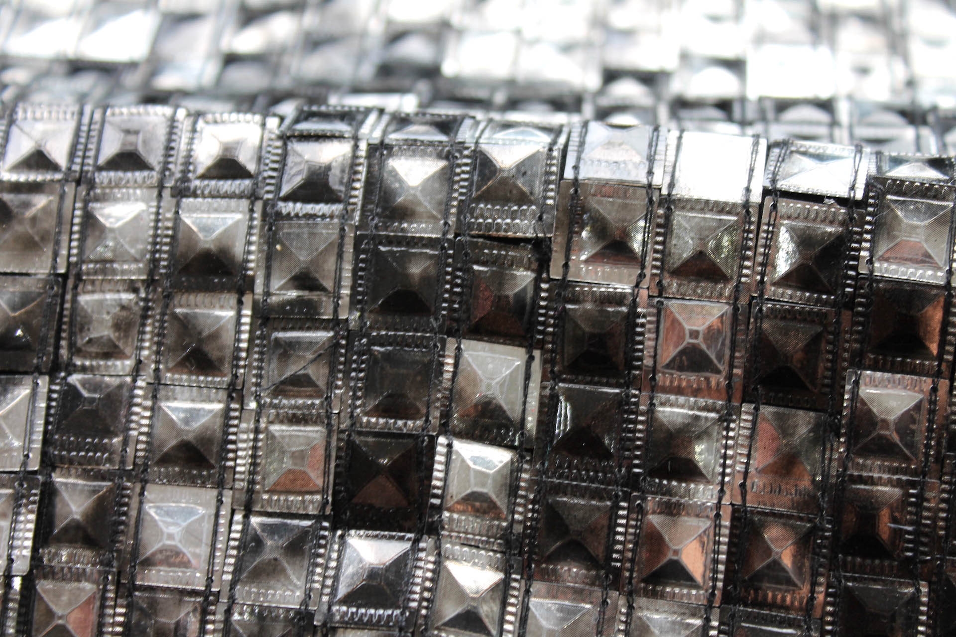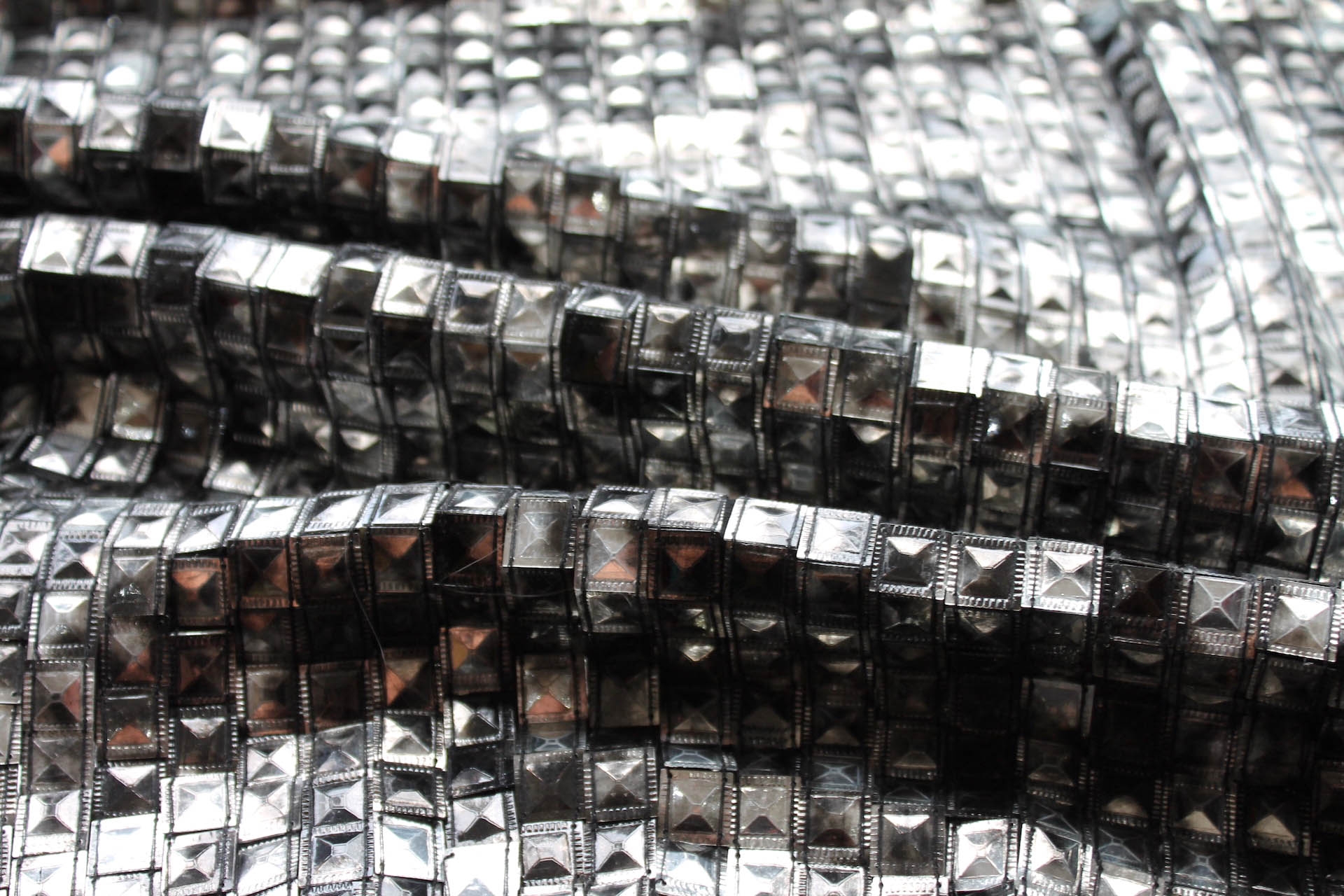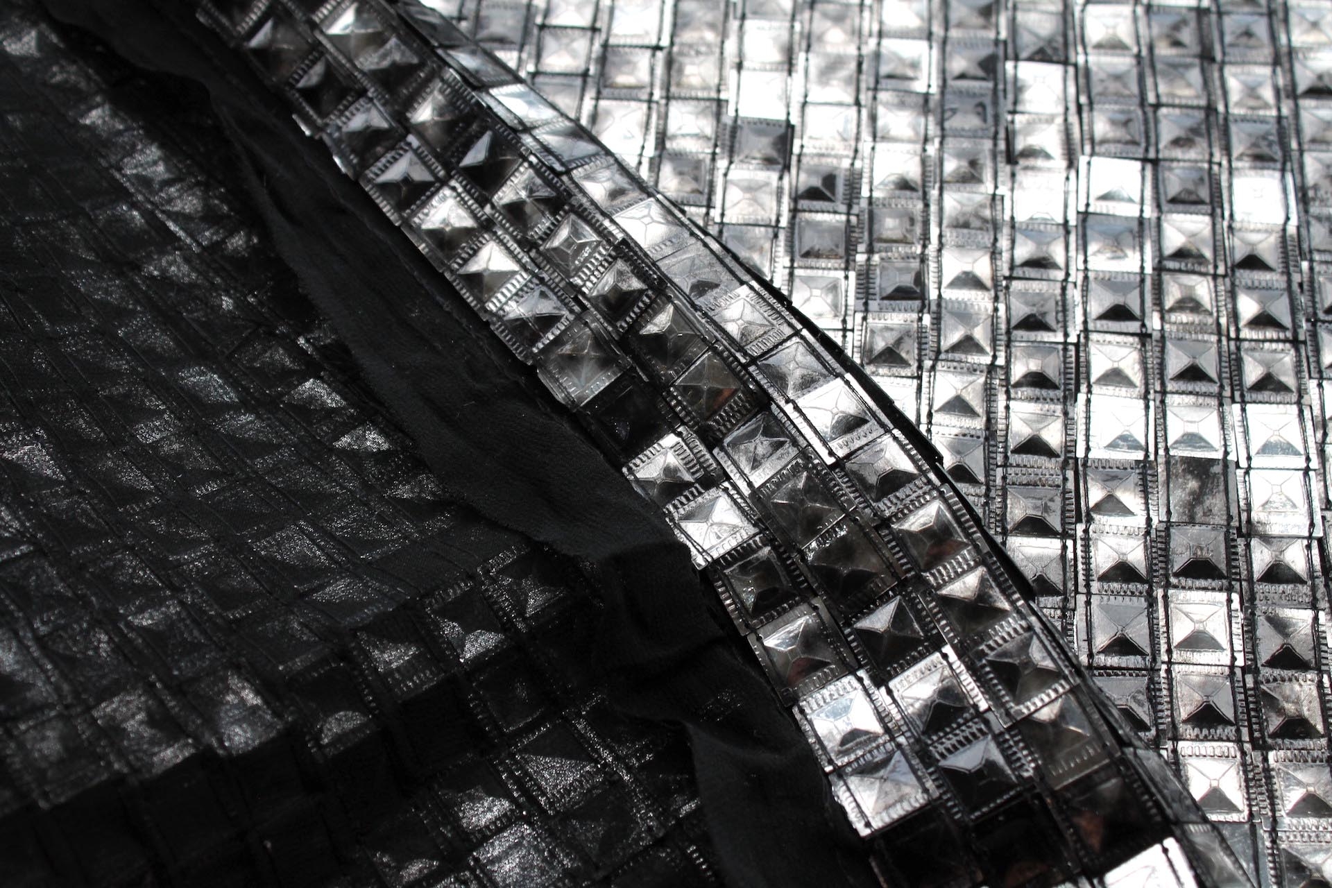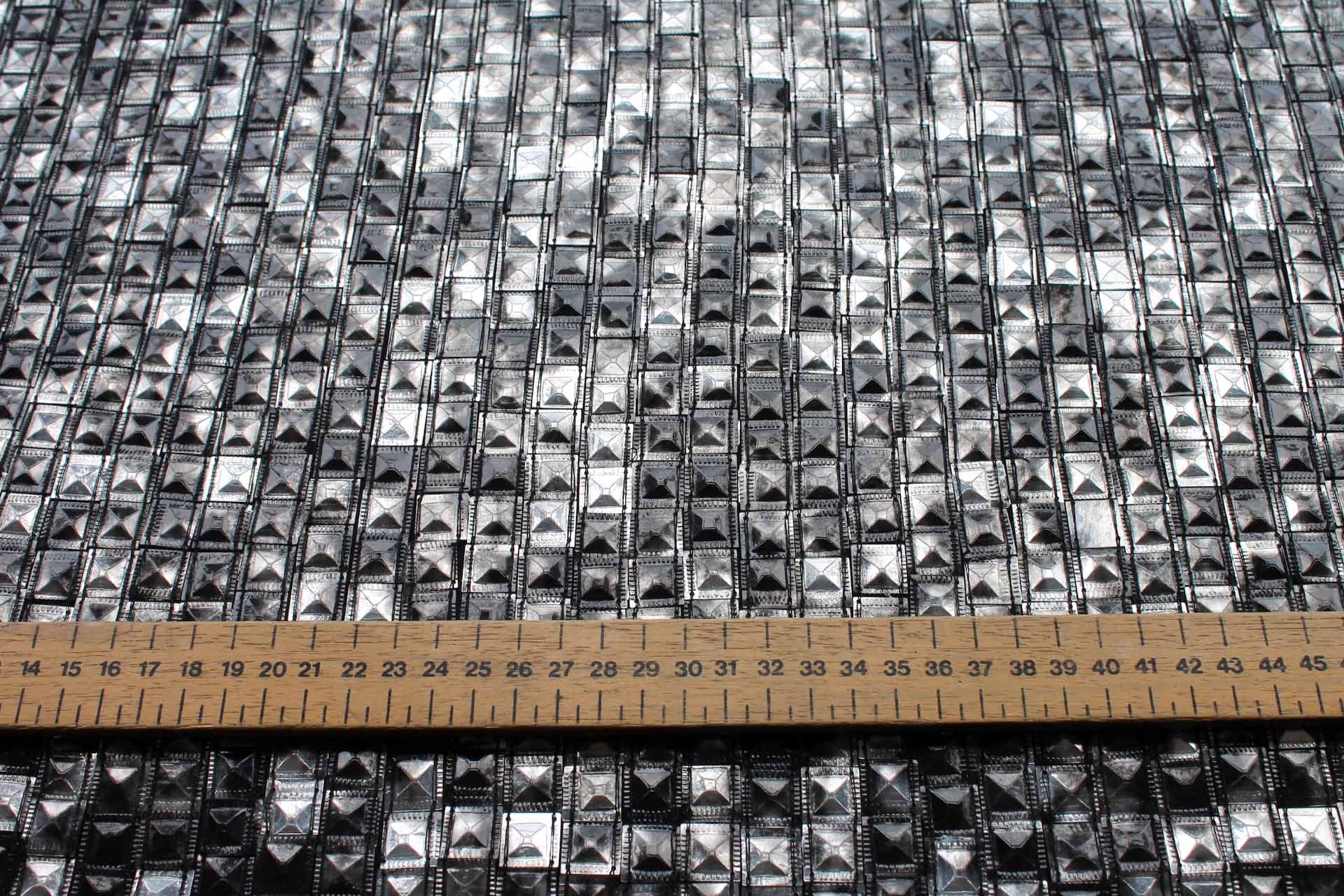 This is a unique sequin fabric developed for us, it has rows of tarnished gunmetal square stud shaped sequins, the sequins measure 1.3cm. Sewn onto black silk chiffon with black thread.