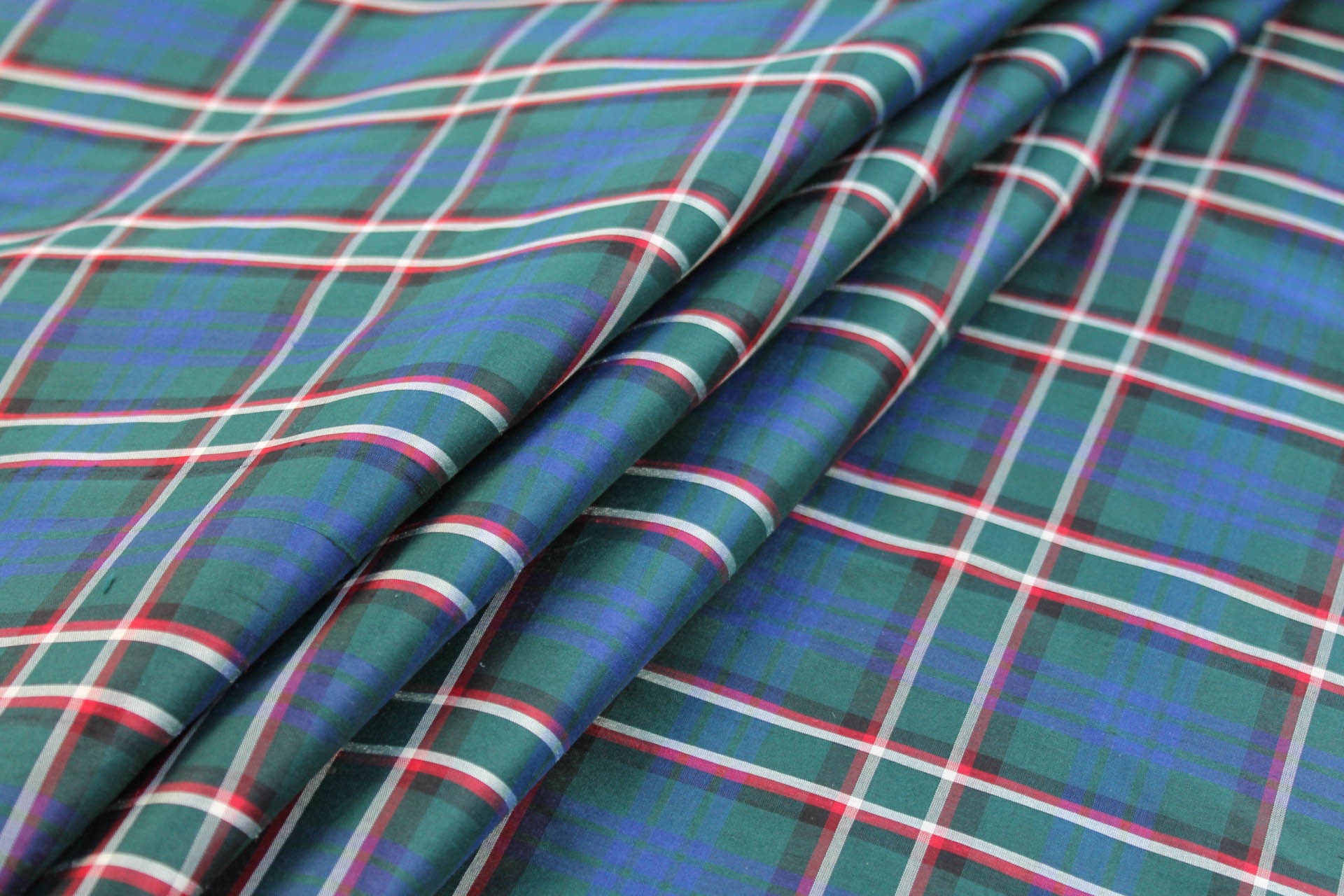This is a woven tartan taffeta in 100% silk, in a classic check combination of blue and green with black, white and red.