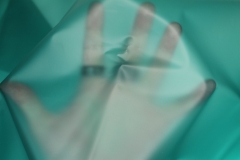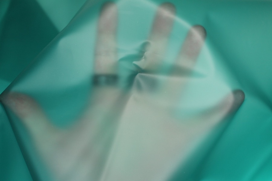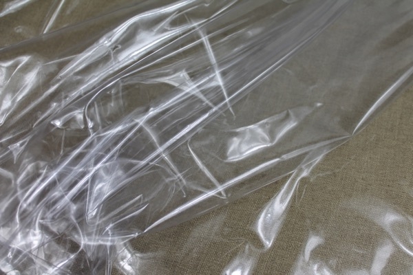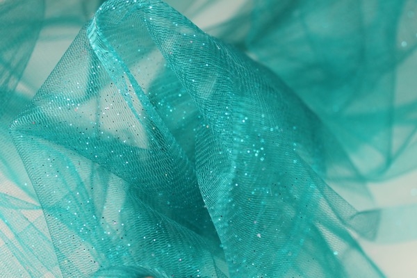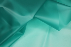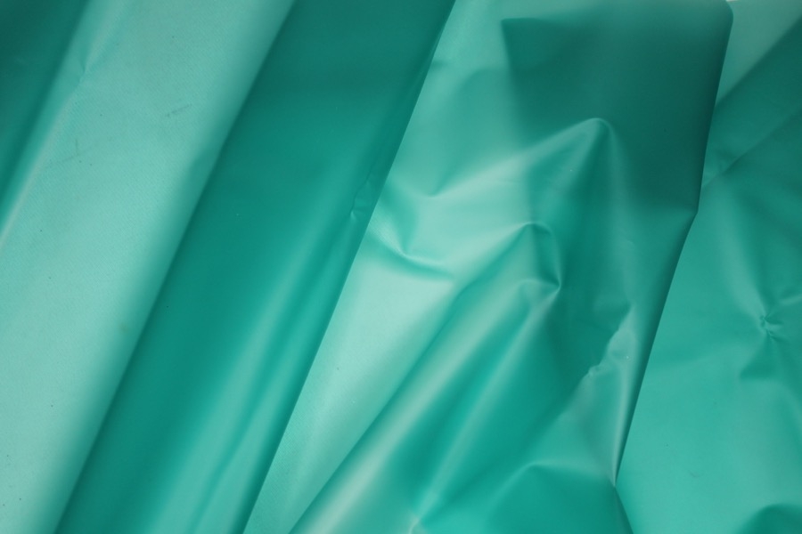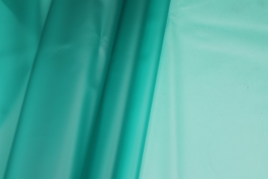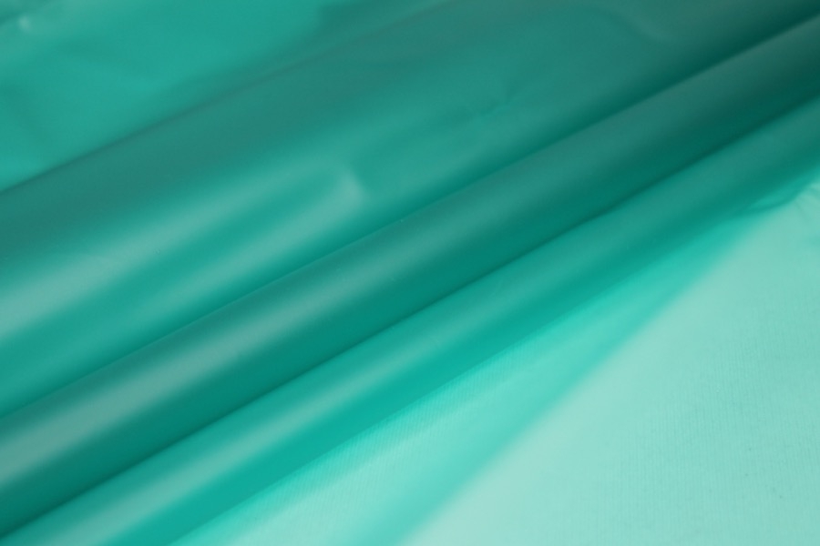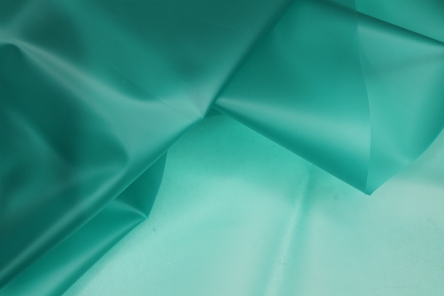 Teal semi transparent PVC look material, semi-sheer plastic type fabric, made of polyurethane, non-woven and thermoplastic. 130cm wide.