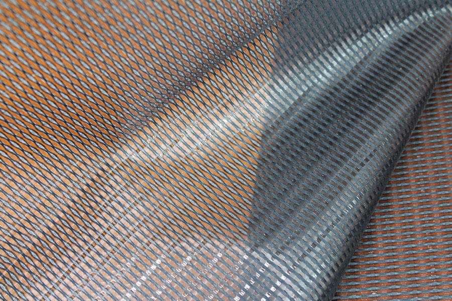 A fine textured organza in bronze and black with a grid pattern, nice and crisp to the touch.