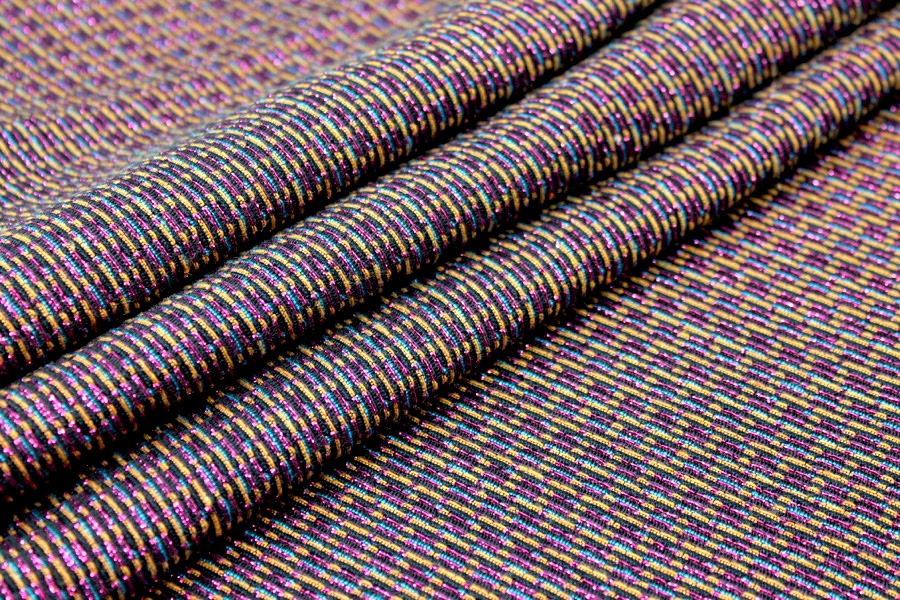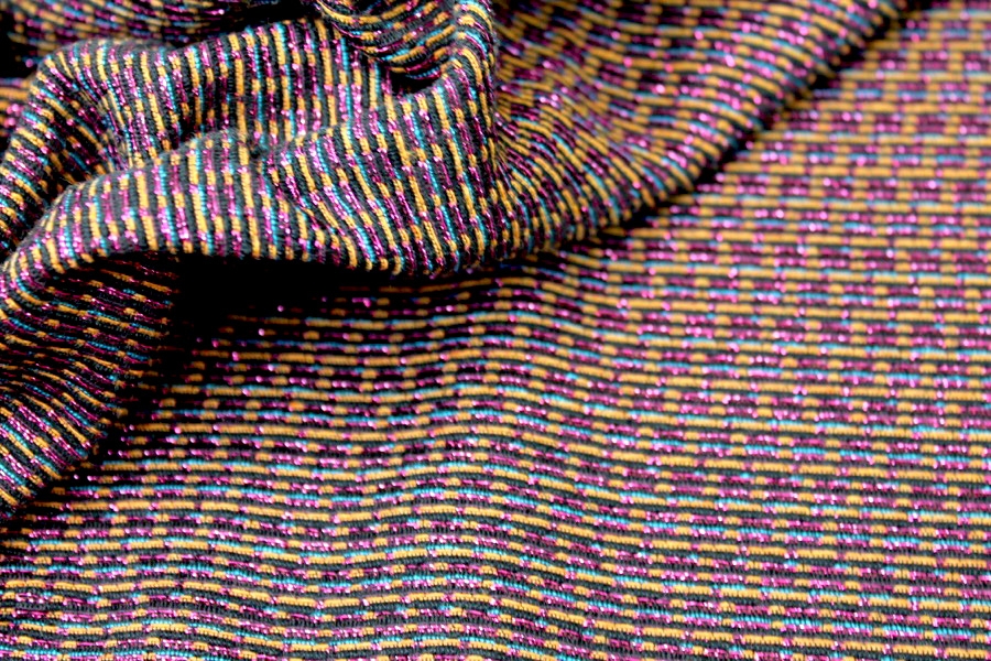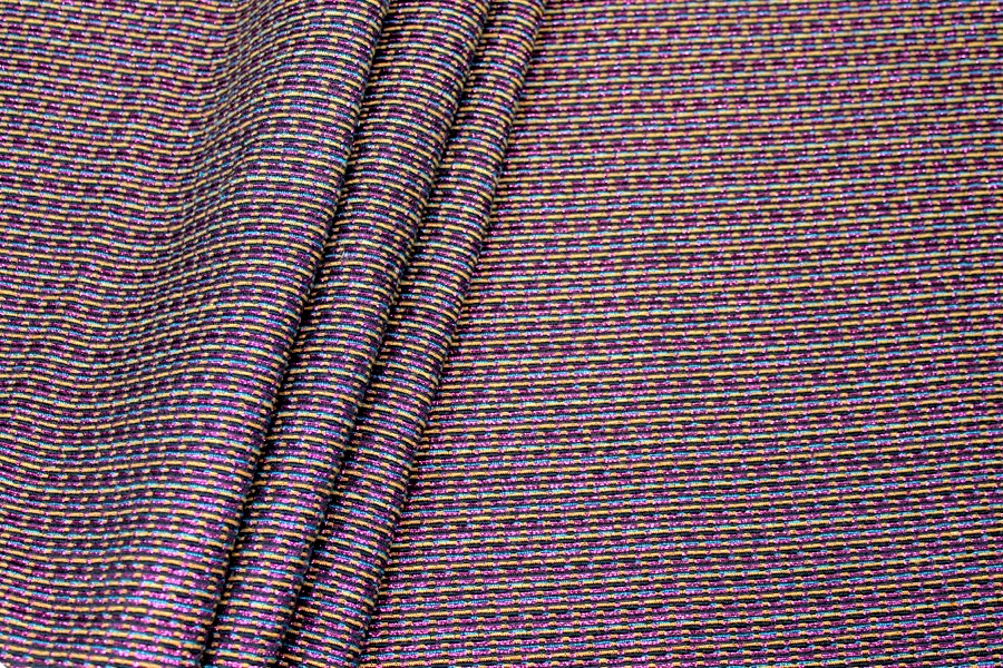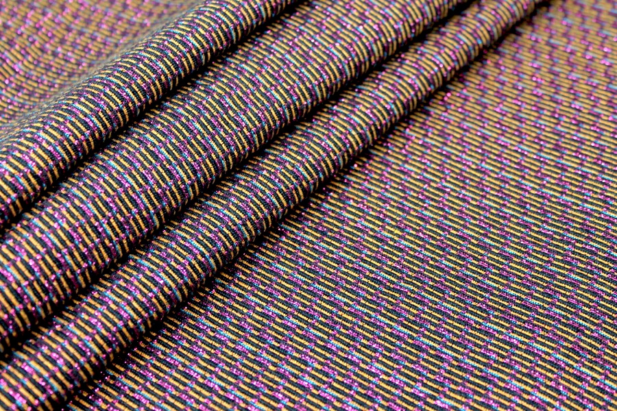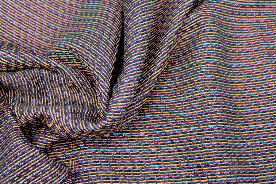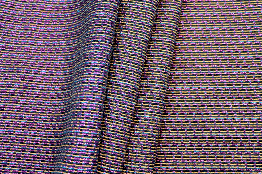 This is a French viscose blend brocade, in pink lurex with gold and blue on a black ground. It is completely flat but gives the illusion of a texture, and reads more pink on one side, more yellow on the other. It would make beautiful tailored dresses, jackets and coats.