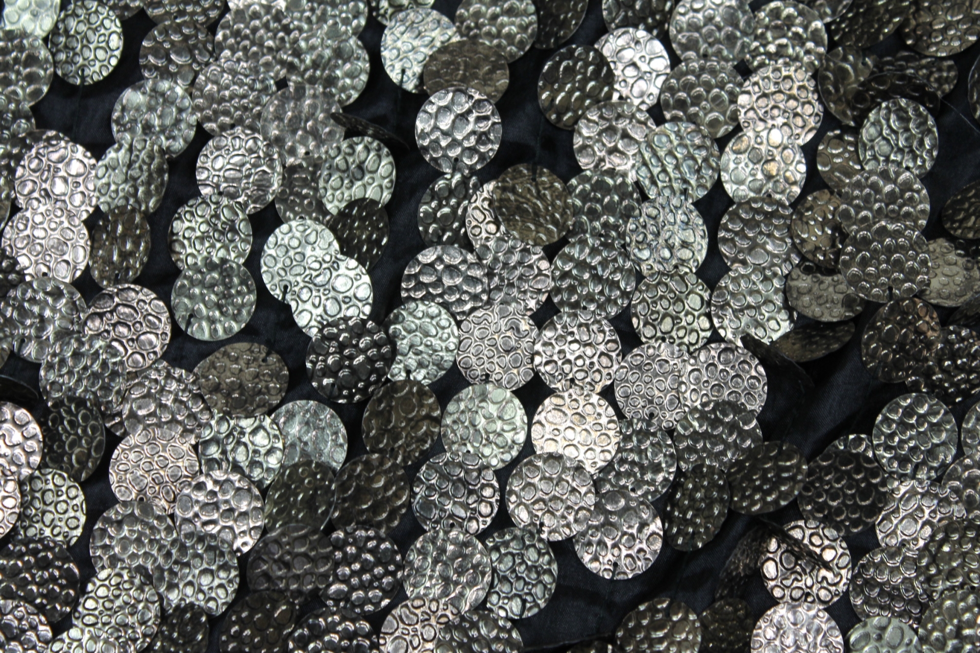 This is a black silk habotai embellished with textured disc sequins in gold, slightly overlapping in lines running down the length of the fabric.