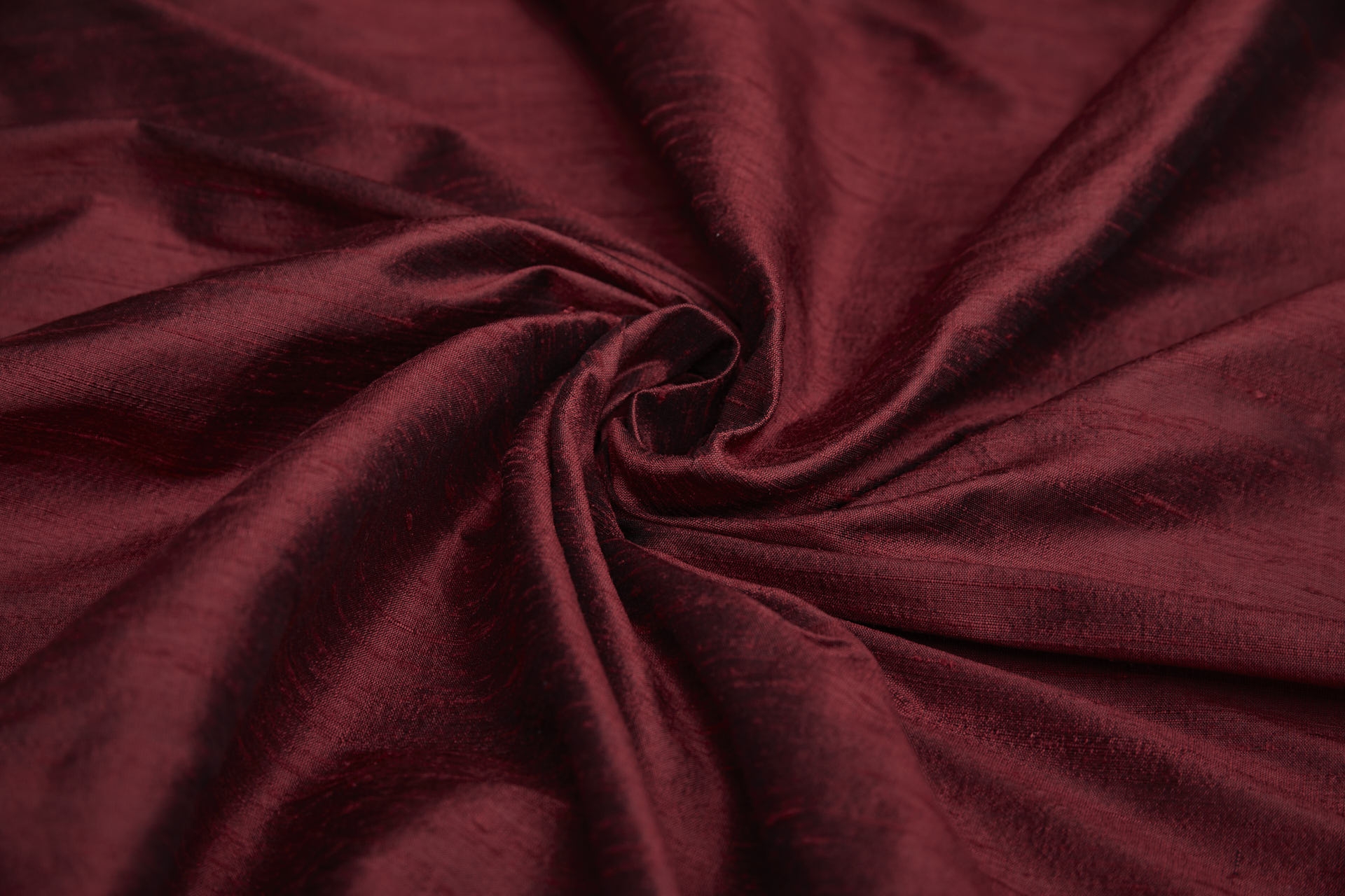 A beautifully structured cloth, traditional Indian dupion is woven with a slubby thread to create a textured effect. Dark red shot black in colour. 100% silk.