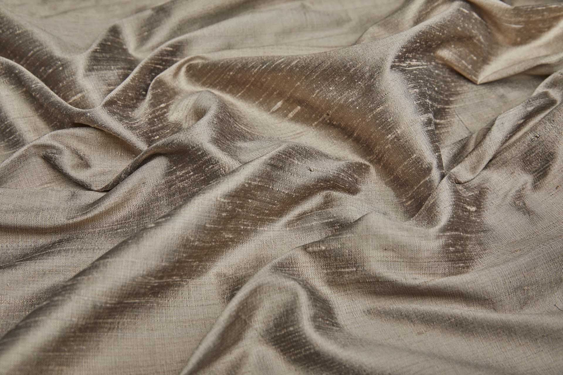 A beautifully structured cloth, traditional Indian dupion is woven with a slubby thread to create a textured effect. Mushroom in colour, a light golden brown shot black. 100% silk.