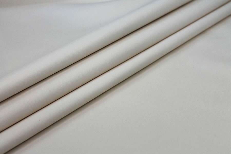 This is a soft textured leatherette in creamy ivory, much like a glove leather it is very supple with a little bit of give. The back is soft, but not like suedette.