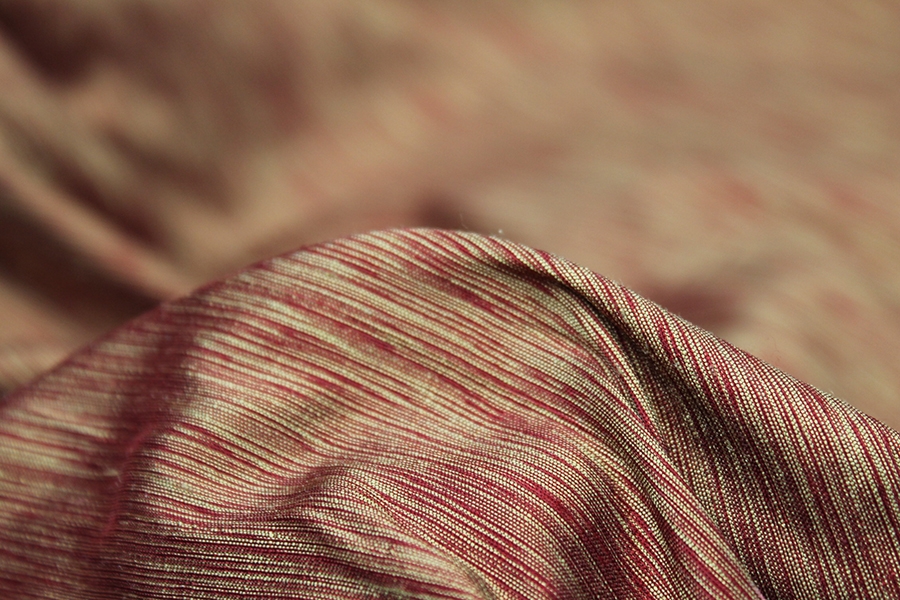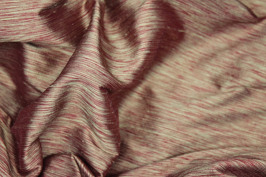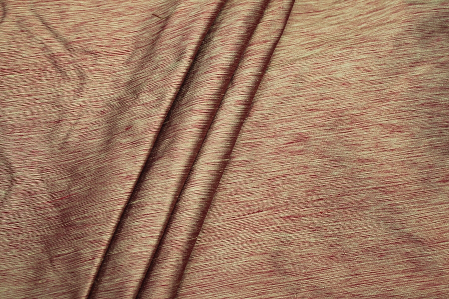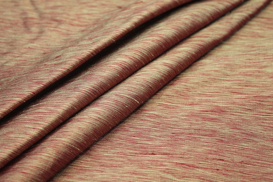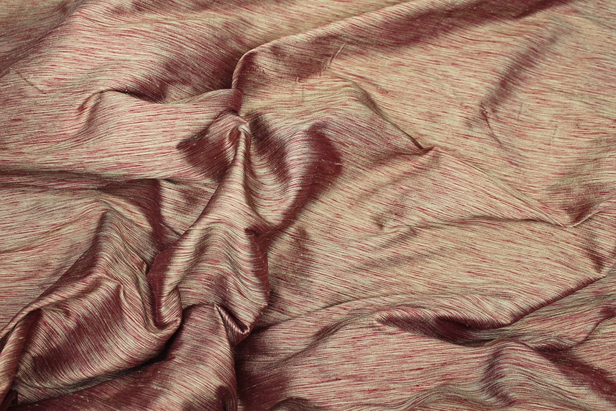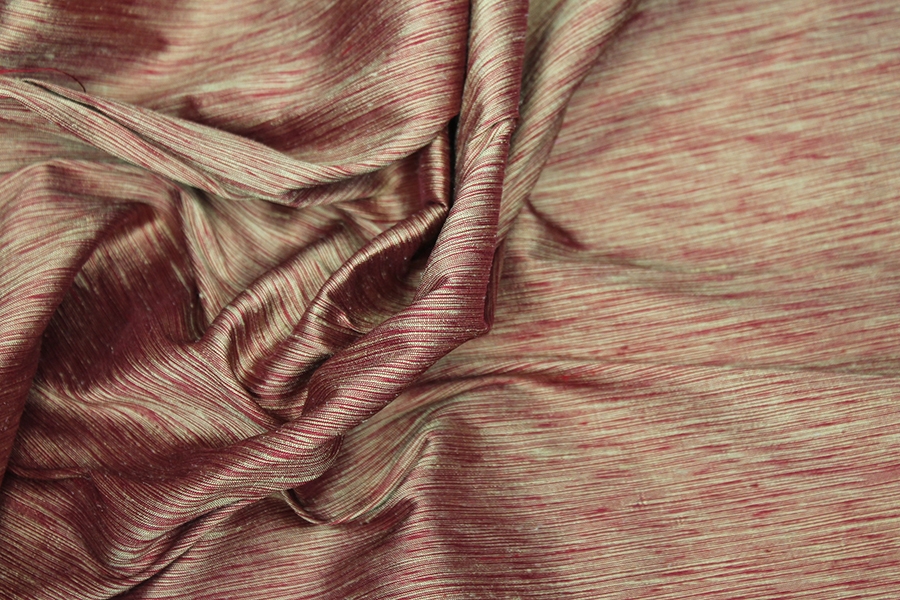 This is a three toned marl silk dupion, woven with a traditional Indian silk yarn to give a textured finish. This one is a red and gold (non-metallic) threads on a black base with uneven finish, giving the classic characteristic of slub silk.