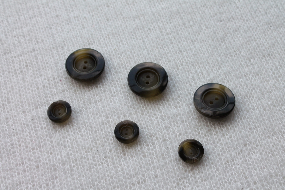 We stock a great range of vintage buttons in nylon, poly resin, horn and metal, as well as fabric covered, along with a few buckles and decorative ornamental pieces. Some are available in multiple sizes, and some are very limited stock.