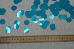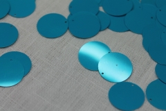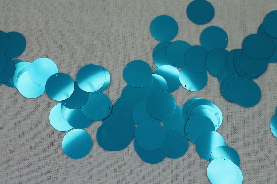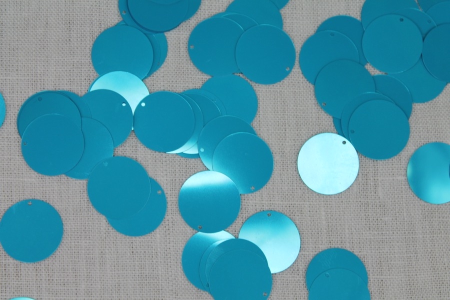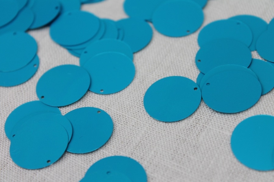 This is a bag of loose plastic sequins in turquoise blue, about 2cm across with the hole in the centre. Sold in bags of 31g, over 600 sequins in each bag.