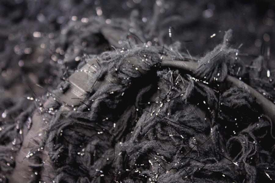 A European made fancy fabric, with tassels or tufts in thread with added lurex, in black.
