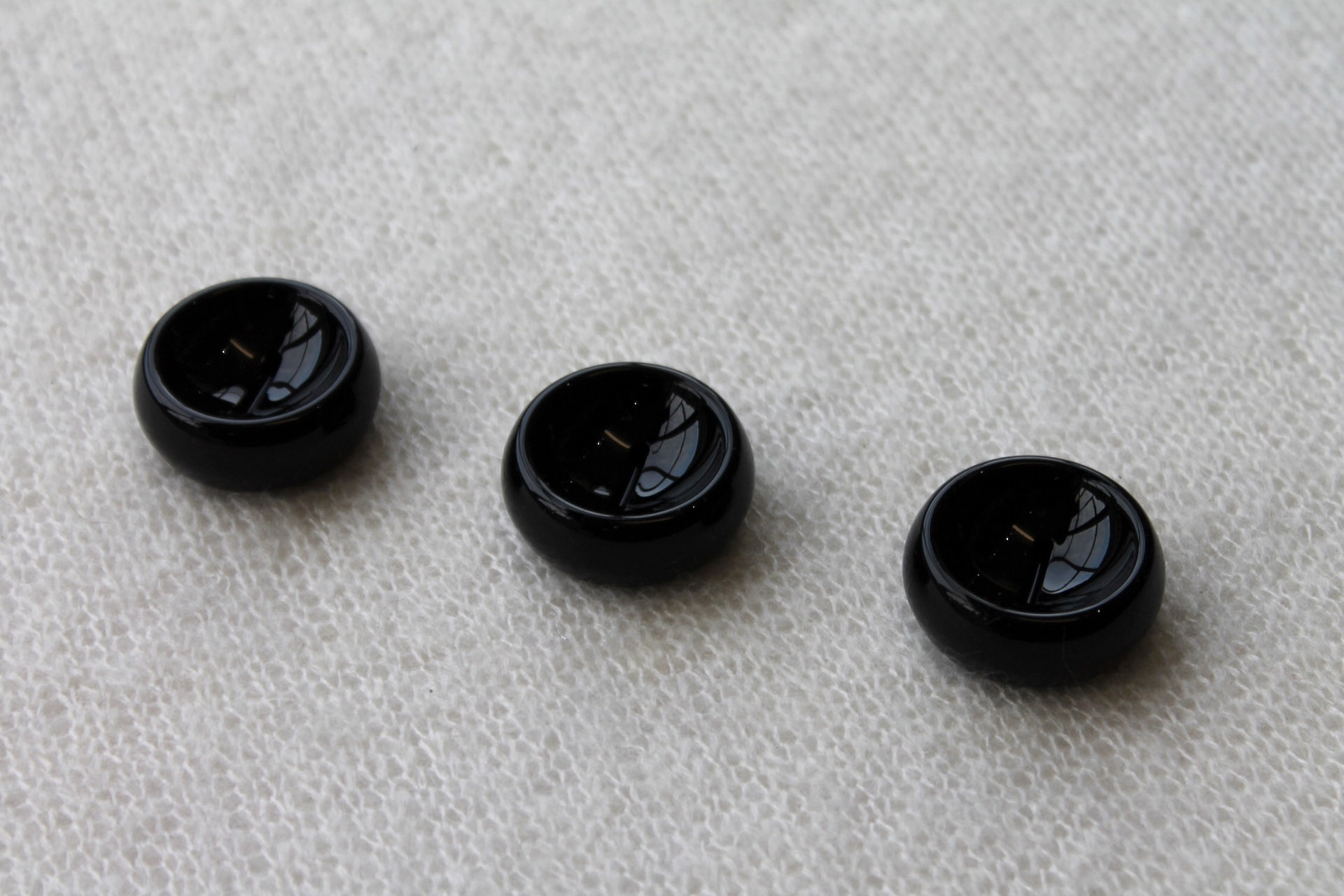 This is a vintage 60s duffel coat style button, in black resin. Measures about 3.5cm across.