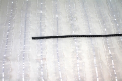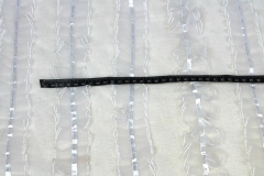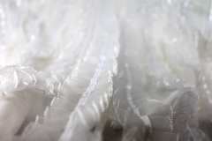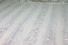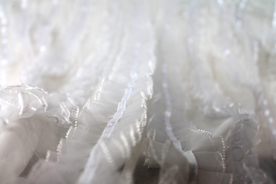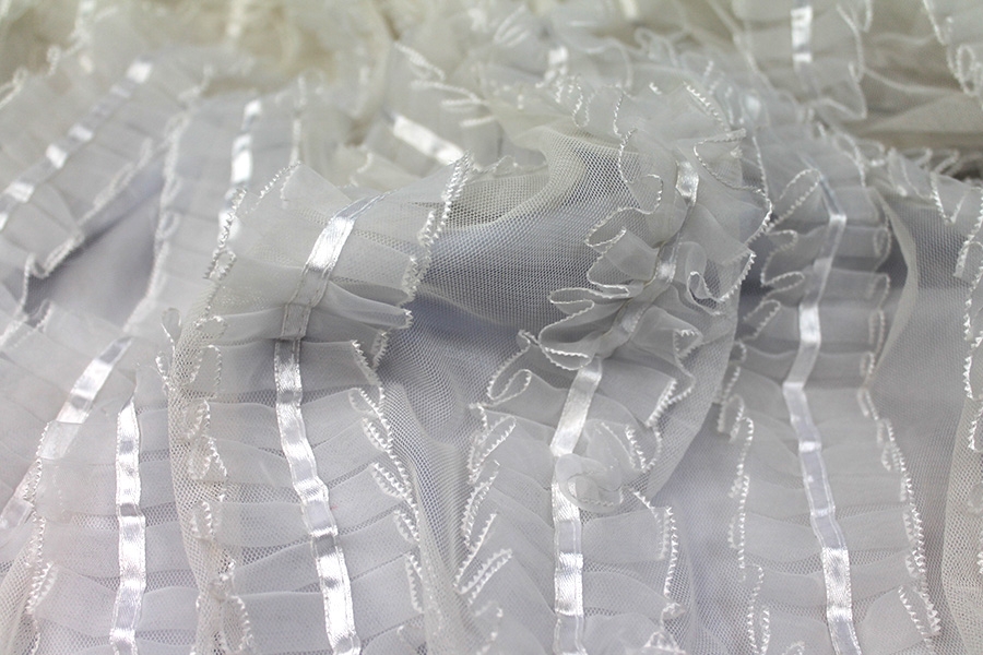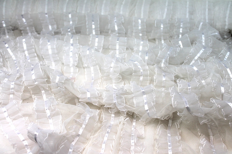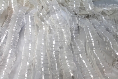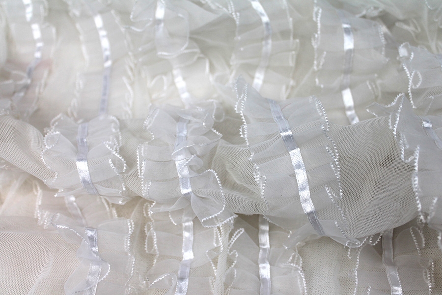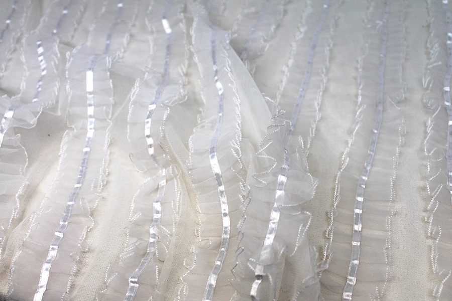 This is a frivolous and fun fabric, made up of white 2 inch wide organza ribbon frills, sewn down on a nylon tulle with a narrow satin ribbon, in stripes going down the length of the fabric, approx 10cm apart. 140cm wide.