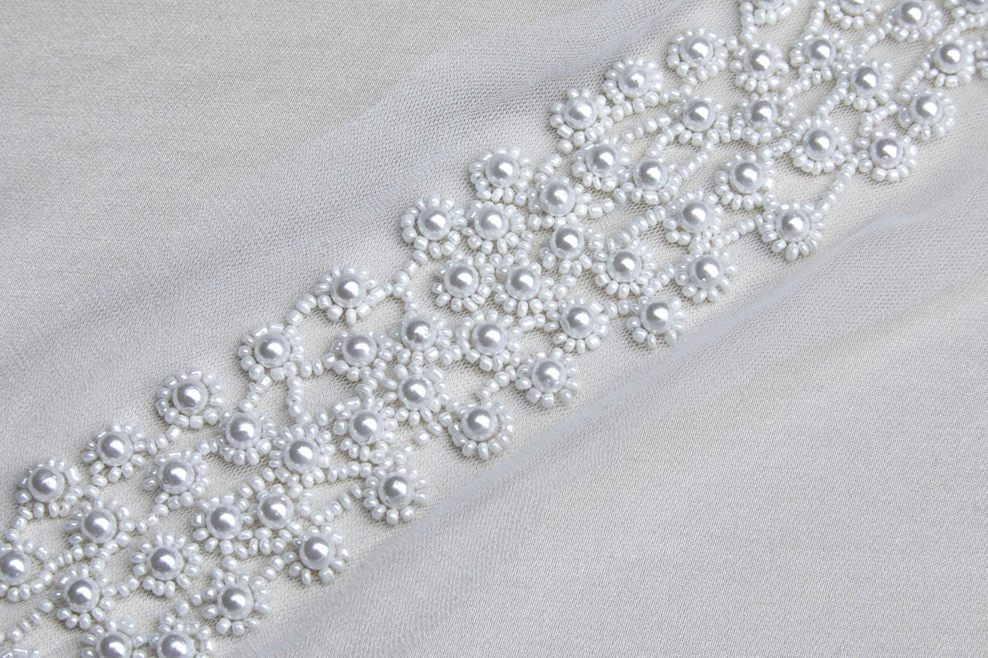 This trim consists of white artificial pearls sewn onto a white tulle, with swirls of white glass seed beads surrounding them.