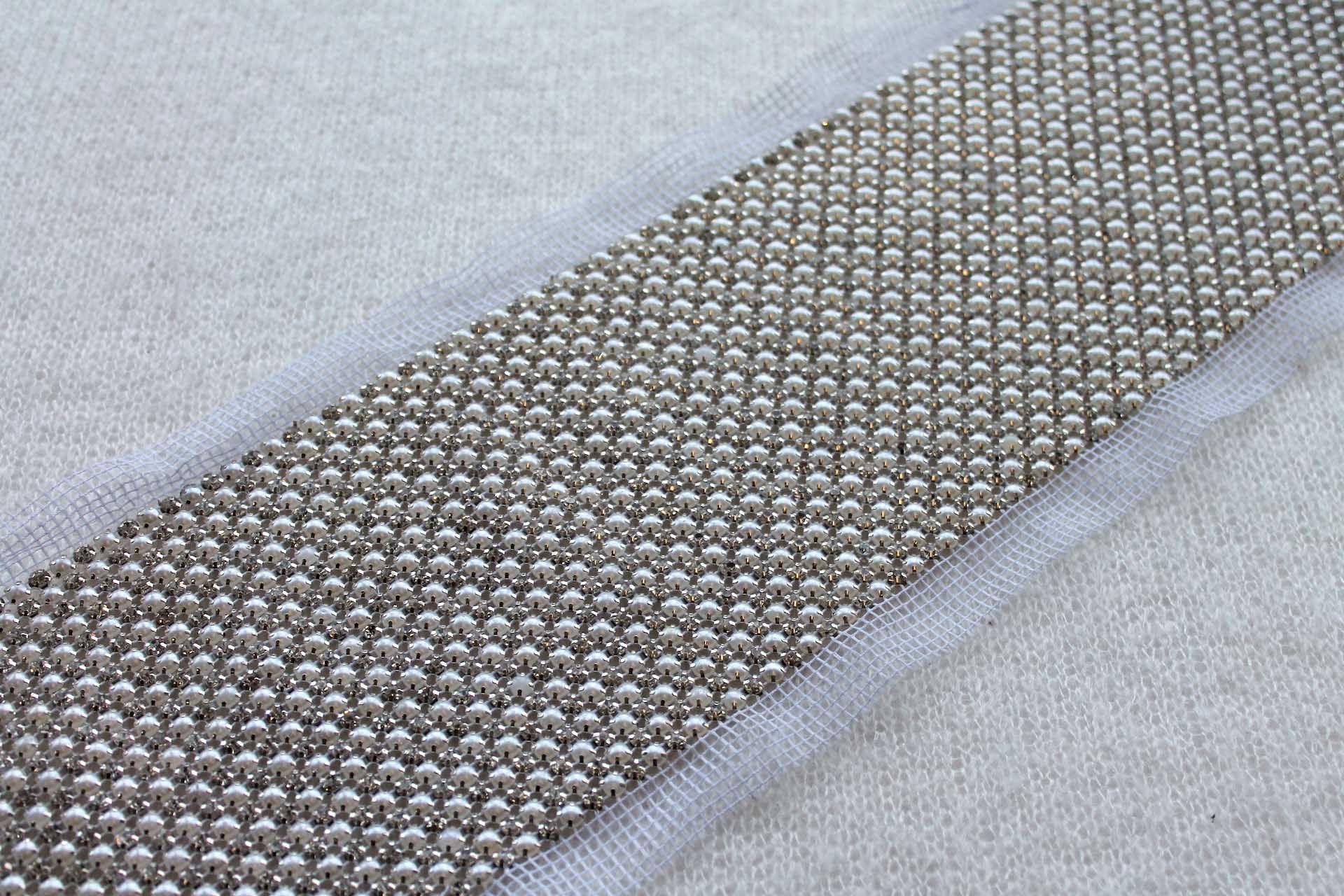 A wider trim with pearl heads and high quality cut glass crystals in a checkerboard pattern. Approximately 12.5cm wide.