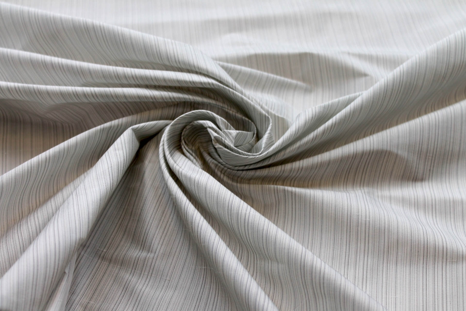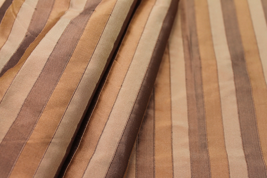 A beautifully structured cloth, woven with a Chinese yarn to give a smoother finish when compared to traditional Indian dupions. Woven in stripes measuring approximately 1cm, in shades of browns, 100% silk.