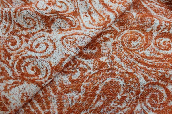 100% wool in a paisley pattern, in green and ivory, reversible with more green on one side, more ivory on the other.