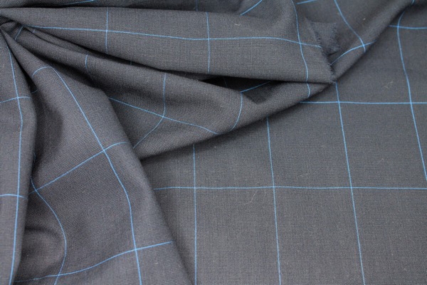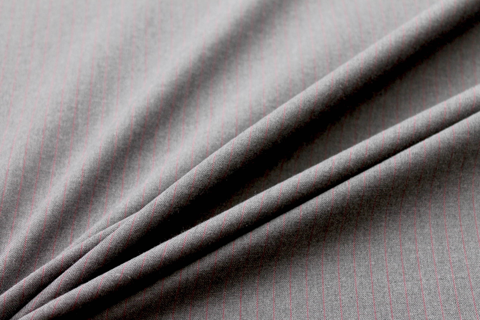 A high quality Italian wool suiting in grey with a burgundy pinstripe, the stripes are approximately 0.8cm apart. 100% wool.