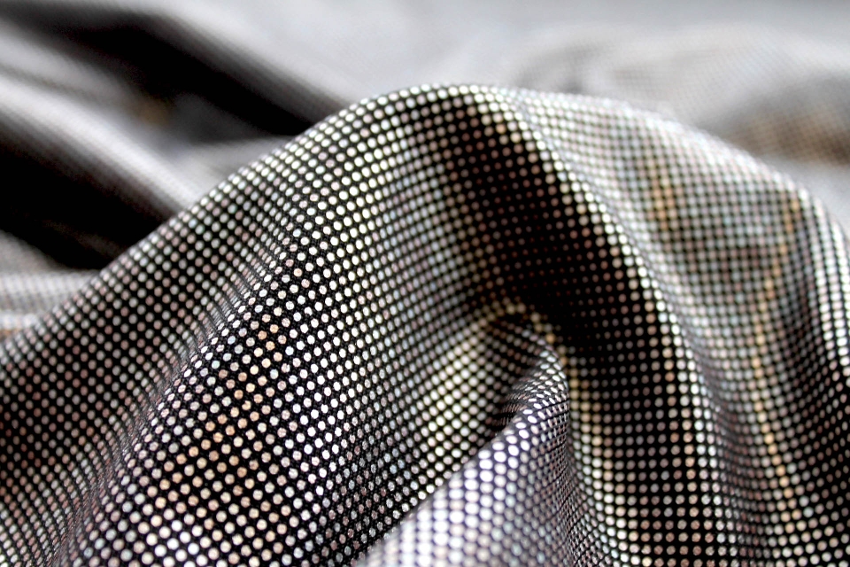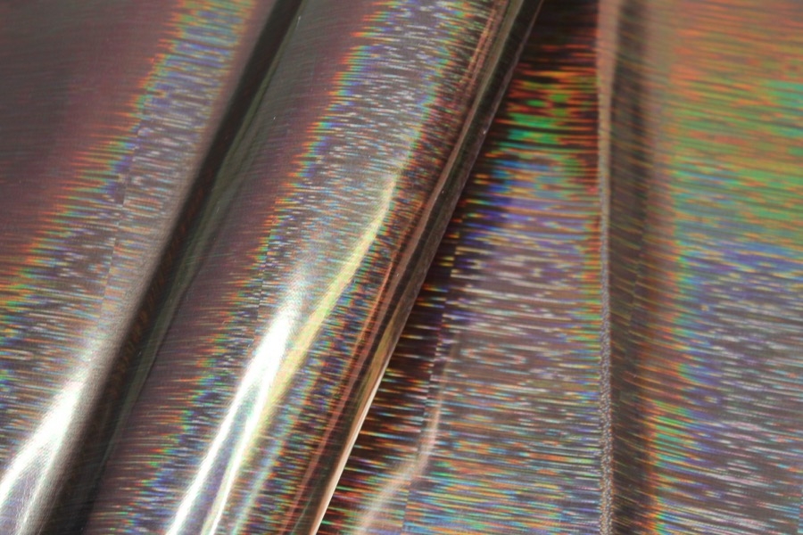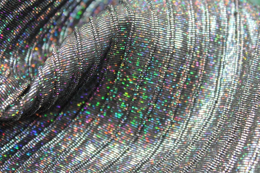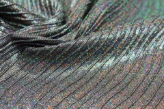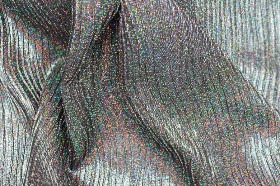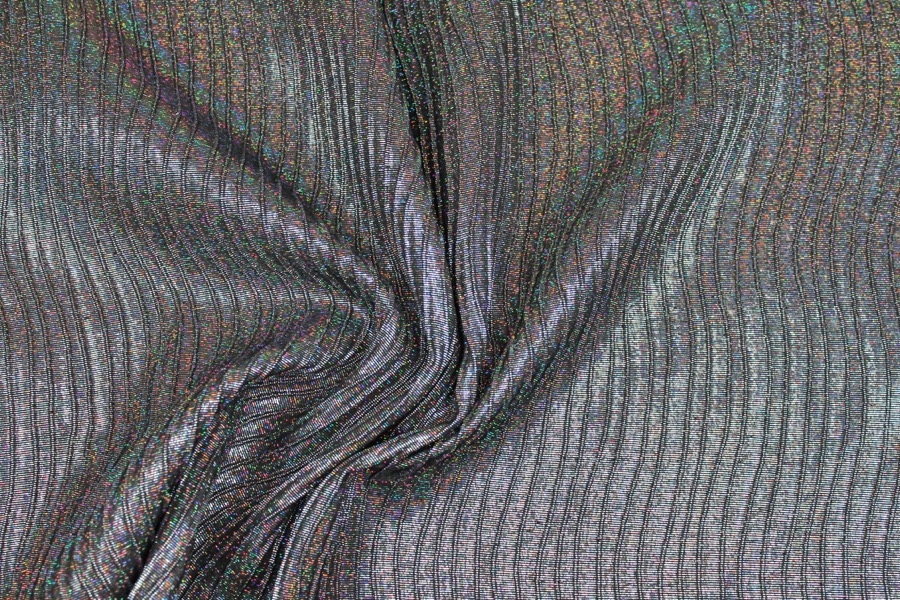 This is a woven brocade in black with holographic silver lurex thread, in a raised wavy line pattern. Perfect for dresses and tailoring. 123cm wide.
