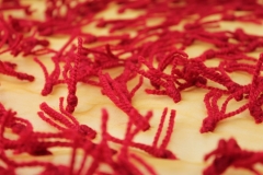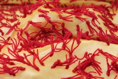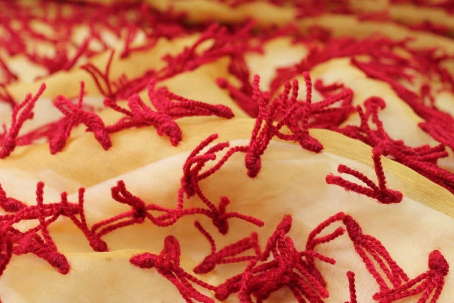 Yarn Tassels on Silk Organza - Red on Yellow